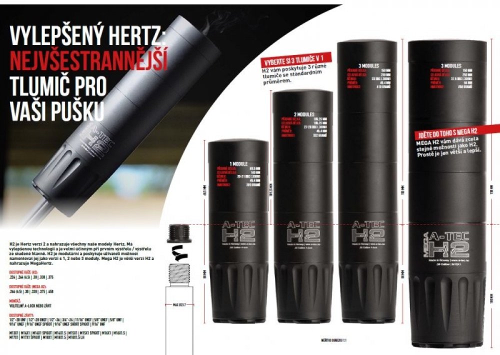 A-TEC H2 a H2 Mega - kompletní popis technická data, seznam ráží a systémů upnutí v katalogu A-TEC v Českém jazyce ke stažení na našich stránkách. Bezkonkurenčně nejžádanější a nejprodávanější model. H2 je modulový tlumič, který je určen pro opakovací, samonabíjecí, lovecké a sportovní zbraně bez předních mířidel. Jde 8cm zpět přes hlaveň a přidává pouze 15cm se všemi 3 moduly k celkové délce zbraně! Jednotlivé moduly lze jednoduše odebírat a docílit tak ještě kompaktnějšího setu zbraně a tlumiče, což může být výhodné např. při naháňkách, dosledech, čištění a údržbě. Model H2 Mega je pouze větší a je určen pro lepší účinek např. u ráží magnum apod. https://www.youtube.com/watch?v=joO_XDBxwOA