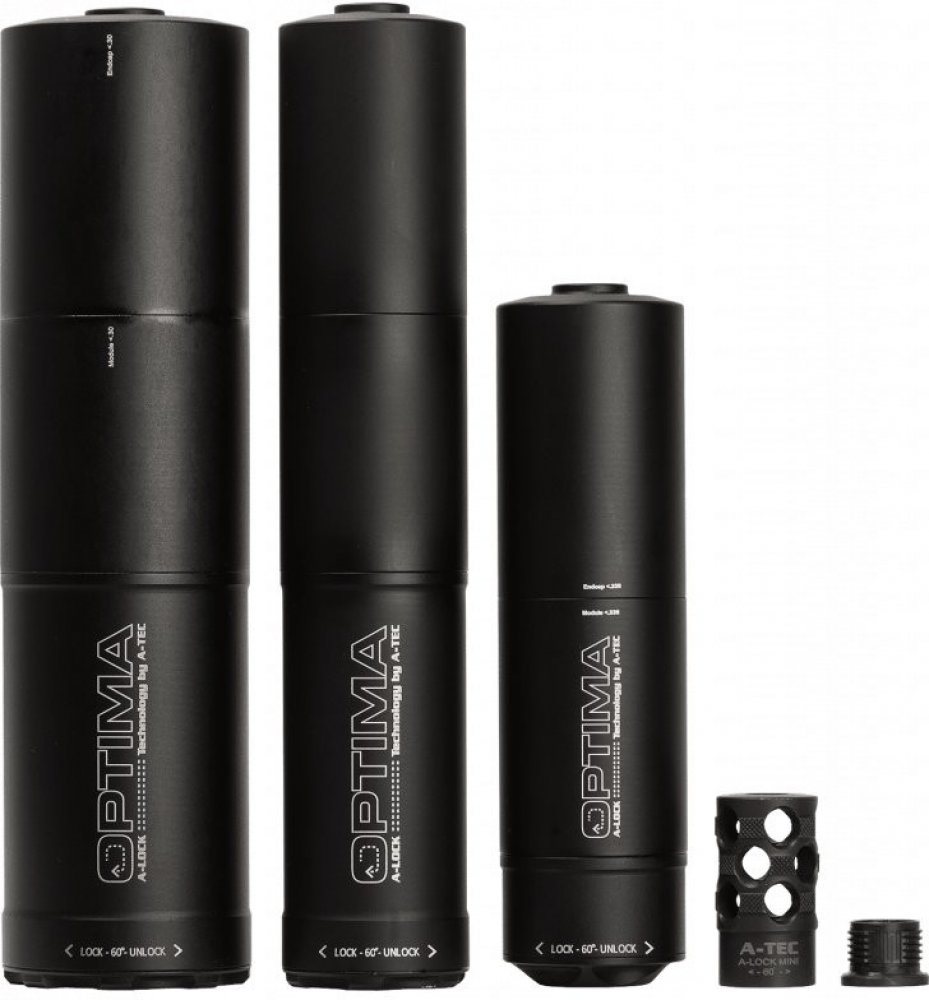 A-TEC Optima - kompletní popis technická data, seznam ráží a systémů upnutí v katalogu A-TEC v Českém jazyce ke stažení na našich stránkách. Modely Optima 60 a 45 jsou určeny pro lovecké a sportovní opakovací, samonabíjecí zbraně, bez předních mířidel. Tlumič jde o 8cm zpět přes hlaveň a přidává tak pouze 15cm k celkové délce zbraně. Přední modul tlumiče je výměnný a lze tak mít jeden tlumič s výměnou sadou modulů pro různé ráže. Model Optima Front je určen pro zbraně s předními mířidly a celou svojí délkou jde dopředu před ústí, opět lze měnit přední modul za modul pro jiné ráže Model Optima Flow je určen speciálně pro samonabíjecí lovecké a sportovní zbraně. Technologie A-FLOW snižuje tlak a tok plynů zpět směrem k výchozímu okénku zbraně. Nejde zpět přes hlaveň a lze měnit přední modul