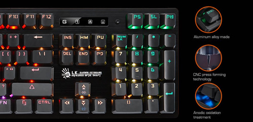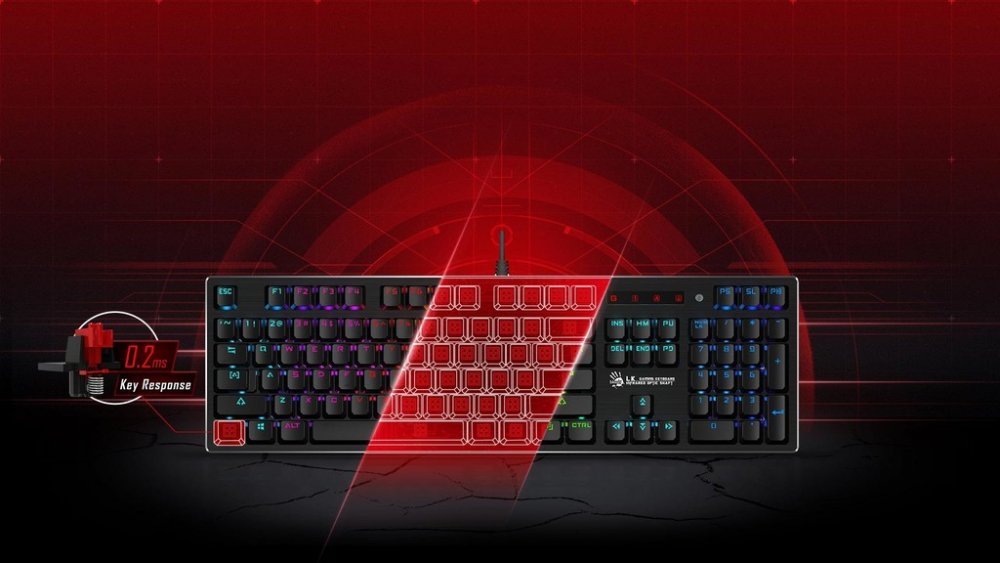 A4tech Bloody B820R je herní klávesnice s RGB podsvícením. Inovativní technologie Light Strike snižuje dobu odezvy kláves na 0,2 ms. Odolnost až 100 milionů úderů, technologie LK Sound Creator a LK Optic Blue Switch.