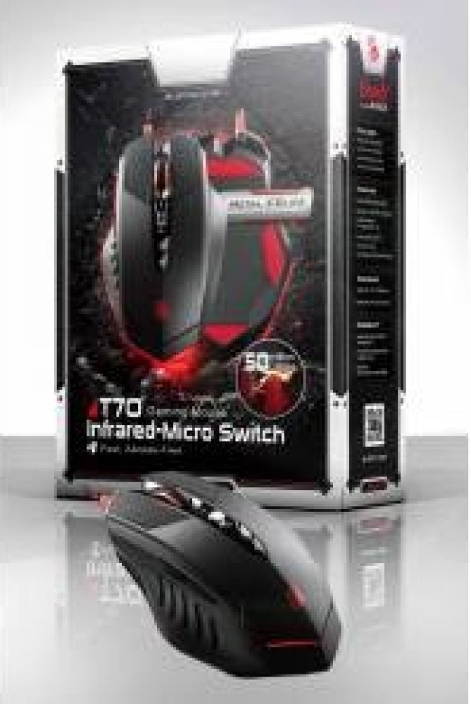 Herní myš T70 v propracovaném vzhledu a skvělé ergonomii. Pogumovaná tlačítka pro lepší komfort.