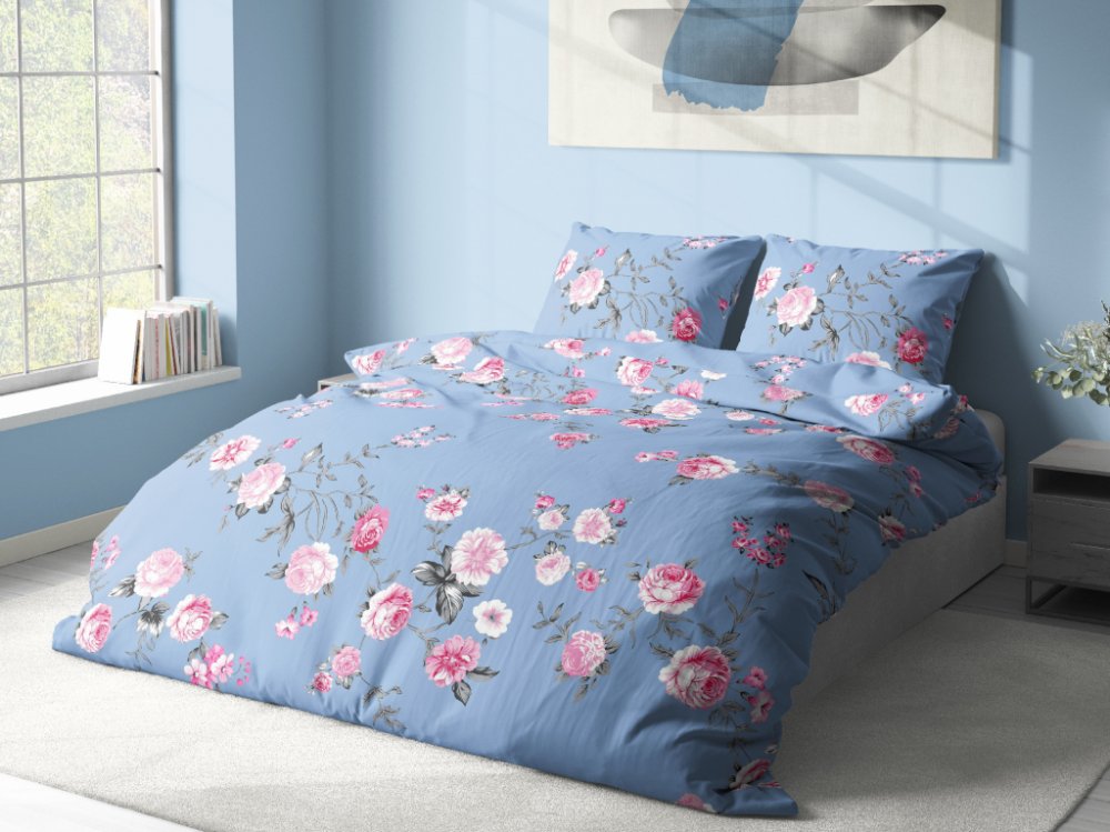 Povlečení Aaryans Růže v modrém provedení působí výrazně, romanticky a dekorativně. Květinový motiv růží je bohatší a vizuálně dominantní, díky čemuž se povlečení stává hlavním prvkem ložnice a dodává prostoru osobitý charakter. Modrý podklad motiv příjemně vyvažuje a přináší do interiéru klidnější, harmonický dojem, aniž by potlačil jeho výraznost.