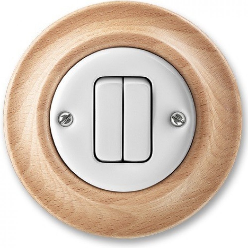 Kompletní vypínač ABB DECENTO řazení č.5 - sériový, lustrový je bílý keramický vypínač s dřevěným rámečkem v retro stylu určený pro domovní i kancelářskou elektroinstalaci. Bílý kulatý retro vypínač z porcelánu s dřevěným rámečkem se stane noblesním doplňkem každého interiéru.