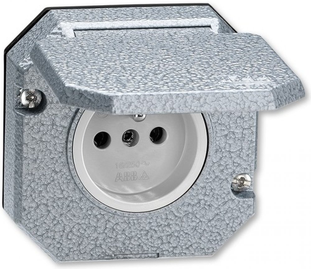 Jednonásobná vestavná zásuvka IP 55 s ochranným kolíkem a víčkem ABB 5518-2790Zásuvku lze připevnit k instalační krabici (s roztečí otvorů pro šrouby 60 mm).