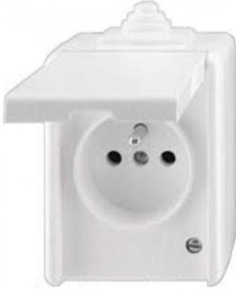 Jednonásobná zásuvka ABB PRAKTIK 5518-2929 B IP44 s ochranným kolíkem a víčkem bílá