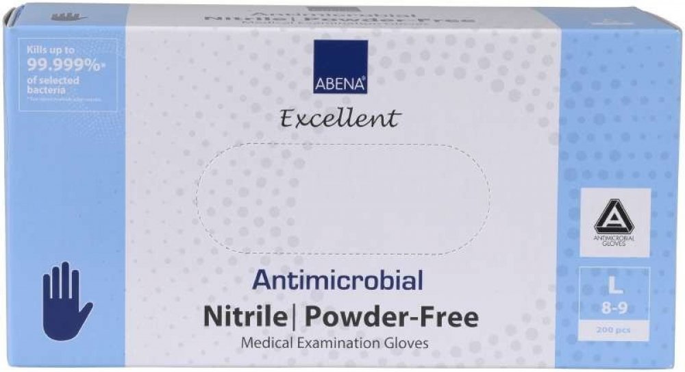 Abena Rukavice antimikrobiální NITRIL L modré 200 ks Jednorázové Antimikrobiální Nitrilové rukavice, nepudrované, barva fialově modrá, texturované na špičkách prstů, nesterilní, obouruké. První rukavice na světě, které nabízejí vysokou úroveň trvalé antimikrobiální ochrany.