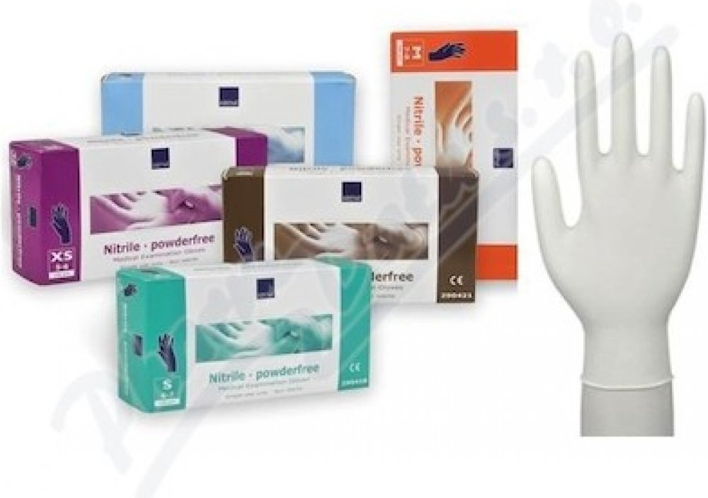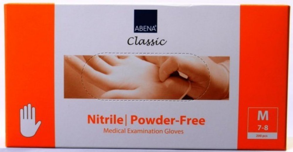 Abena jednorázové nitrilové rukavice, nepudrované, bílé barvy s texturou na špičkách prstů, nesterilní, obouruké. Vysoce elastické z pevného nitrilového materiálu pro snadné navlékání/svlékání, jsou odolné vůči roztrhnutí a zároveň tenké pro zachování citu v rukou. Mohou být použity v Autoklávu. Vhodné pro manipulaci s potravinami. Balení obsahuje 200 ks rukavic velikosti M.