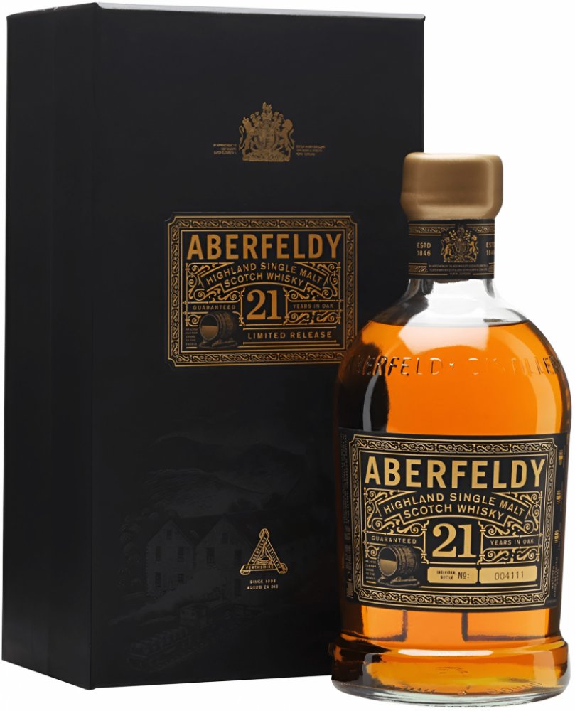 Aberfeldy 21yo je single malt skotská whisky z regionu Highland, která byla stařena 21 let v sudech po víně sherry a po bourbonu a dokončena v sudech po vínu Madeira. Aroma medu, čerstvého ovoce, lehká kouřovitost a slad. Chuť rozinek, medu, vanilky a kouře. Závěr je delší a hřejivý.
