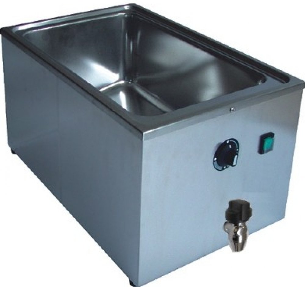Celonerezová konstrukce s jedním topným tělesem pod vanou ovládaným mechanickým termostatem s regulací teploty do 90 C. a el. kabelem 1,5 m.Jednodílné zařízení s výpustným kohoutem na pryžových nožkách.Stolní vodní lázeň se používá ve stravovacích provozech k přihřívání a výdeji hotových jídel. Ta se do stolní bain-marie vkládají v nerezových gastronádobách.S výpustným ventilemRozměry (mm): 680x375x320Kapacita (GN): GN 1/1 200Příkon (kW): 0,7Hmotnost (kg): 12