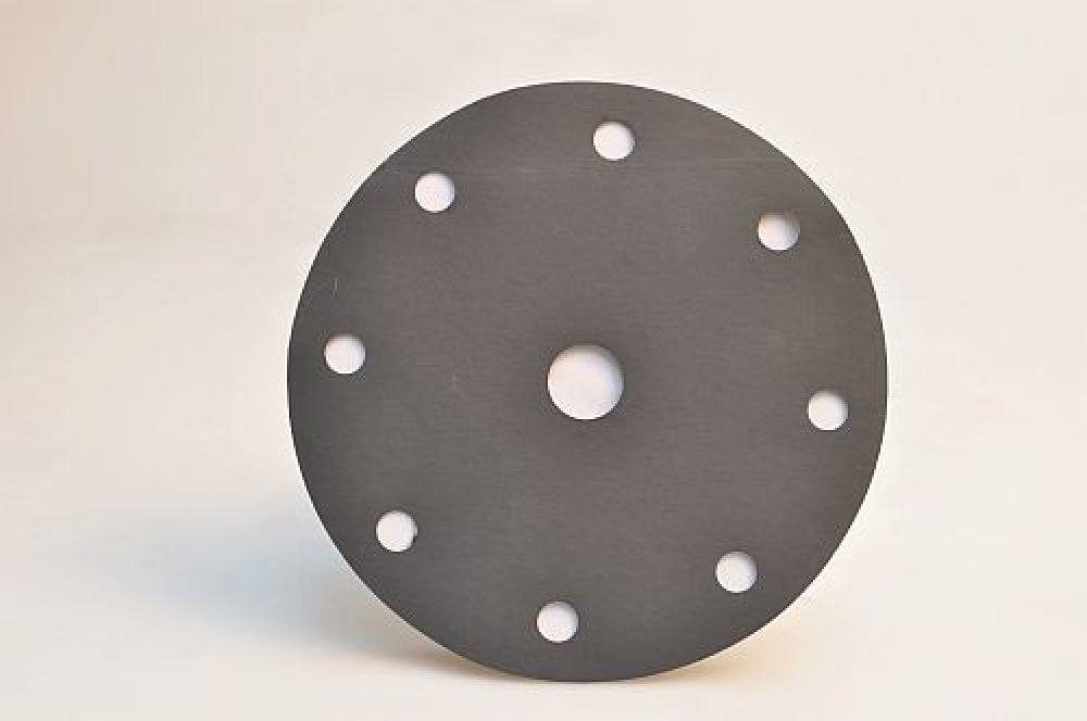 výsek brusného papíru na sklo, mramor, kámen, keramické materiály a plasty, laky a tmely brusný disk s upínáním na suchý zip - kruhový výsek z brusného papíru vhodný na sklo, mramor, kámen, keramické materiály a plasty, laky a tmely pro broušení za sucha i za mokra provedení F8 - 8 děr o průměru 10 mm na rozteči 120 mm a středová díra o průměru 18,5 mm podklad - papír C, podlepený vrstvou veluru (...