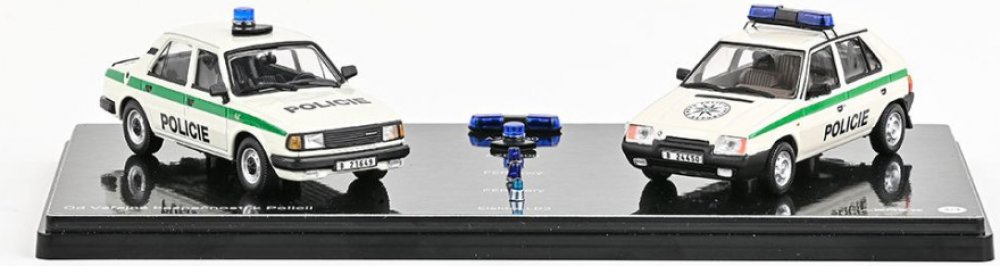 1:43 Od Veřejné Bezpečnosti k Policii (4/4) Abrex. Sběratelské modely, Záchranná vozidla. Exkluzivní duopack v měřítku 1:43 z unikátní čtyřdílné série Od Veřejné Bezpečnosti K Policii, znázorňující tehdejší unifikované označení vozů Veřejné bezpečnosti a Policie, a to konkrétně na kovových modelech Škoda 120L (1984) a Škoda Favorit 136L (1988), včetně tematického historického vývoje nejčastěji používaných majáků daných složek.