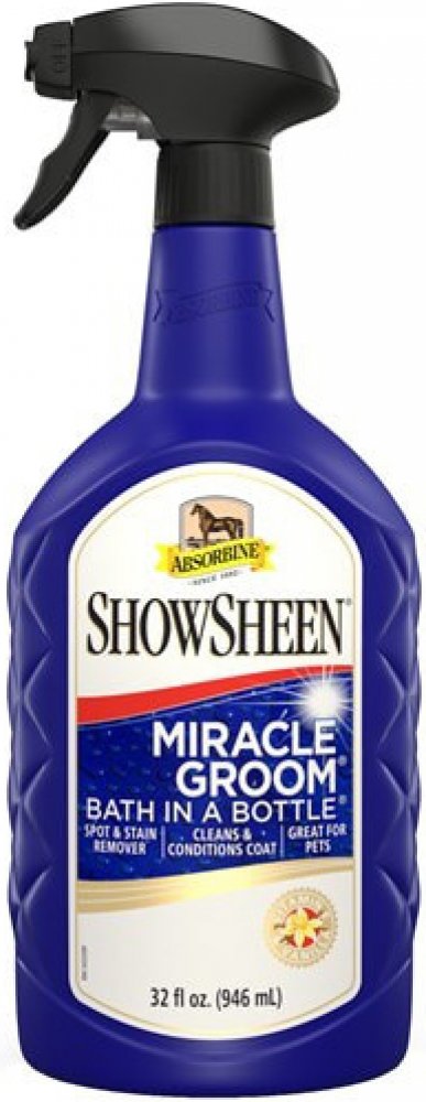 Absorbine Miracle Groom je přípravek 5v1, který srst koně čistí, vyživuje, zbavuje zápachu, rozčesává hřívu a ocas a dodává srsti a žíním hedvábný lesk. To vše s velice jednoduchou aplikací bez použití vody.