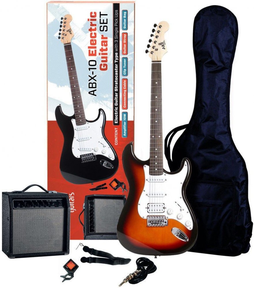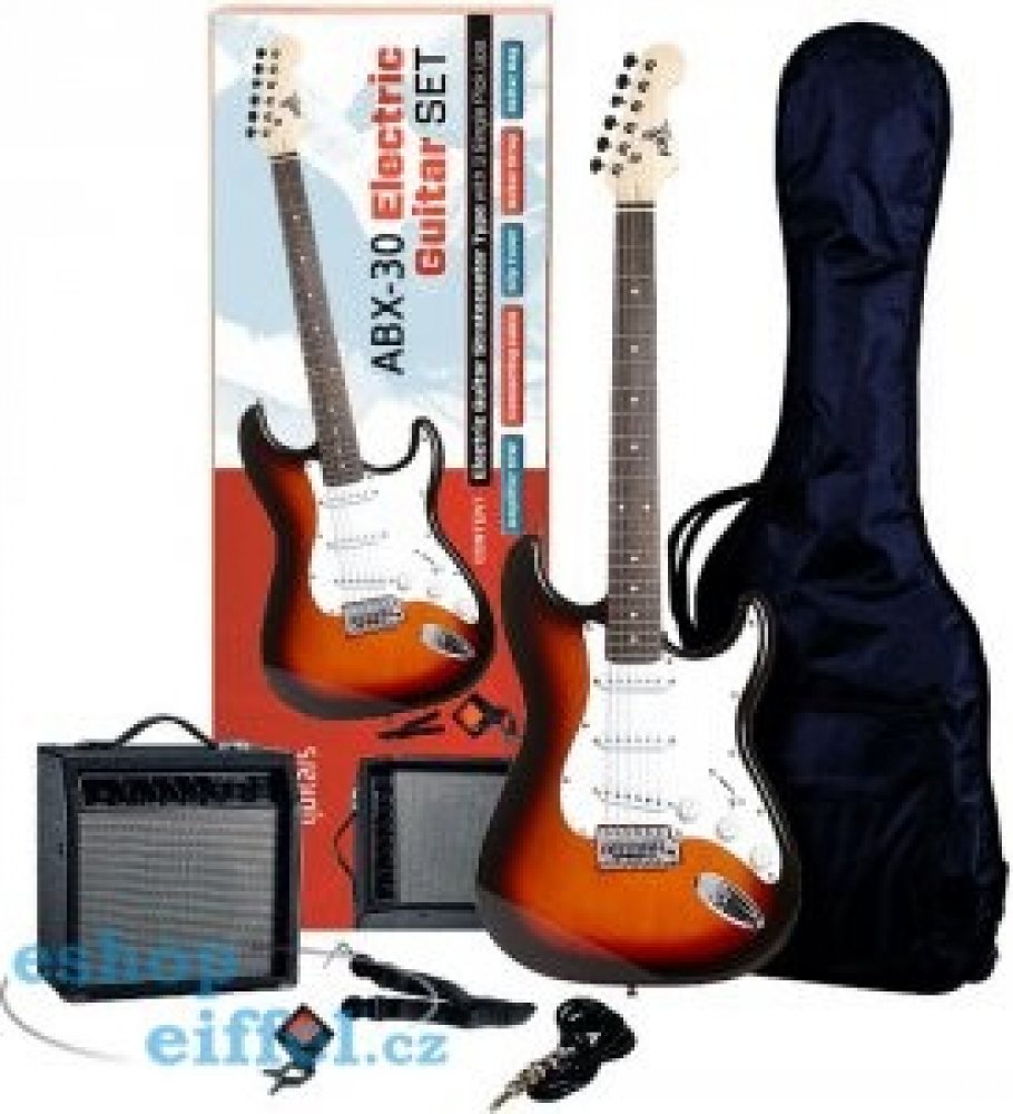 Kytarový set obsahující elektrickou kytaru typu ST značky ABX, kytarové kombo, ladičku, pás, nástrojový kabel a pouzdro. Kytara ABX ST230 je vybavena snímači v konfiguraci SSS, které se ovládají pomocí 5 polohového přepínače a trojice potenciometrů Volume, Tone 1 a Tone 2. Kytara je vhodná pro všechny typy žánrů. K dispozici je i kytarové kombo s výkonem 10 W a čistým a zkresleným zvukem pro domácí cvičení. Součástí setu je i kabel s konektory Jack 6,3 mm, pás s nastavitelnou délkou a klipová ladička, která váš nástroj udrží naladěn. Set uzavírá nylonové kytarové pouzdro se zipovým zavíráním a rukojetí. Set je vhodný pro začínající kytaristy. Barevné provedení kytary: 3 Tone Sunburst.