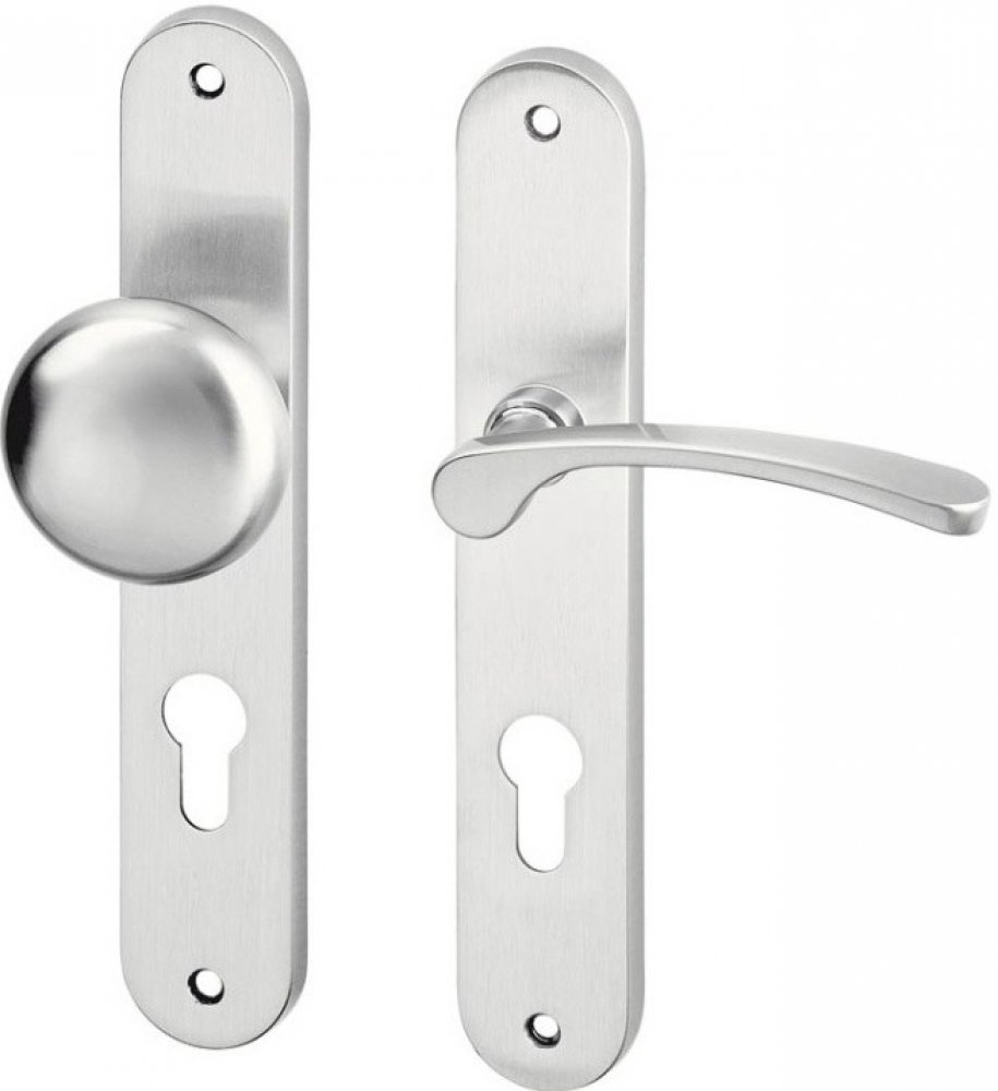 Klika je spojená se štítem a s vratnou pružinou. Bez trnů proti pootočení. Štíty jsou prošroubované skrz dveře.