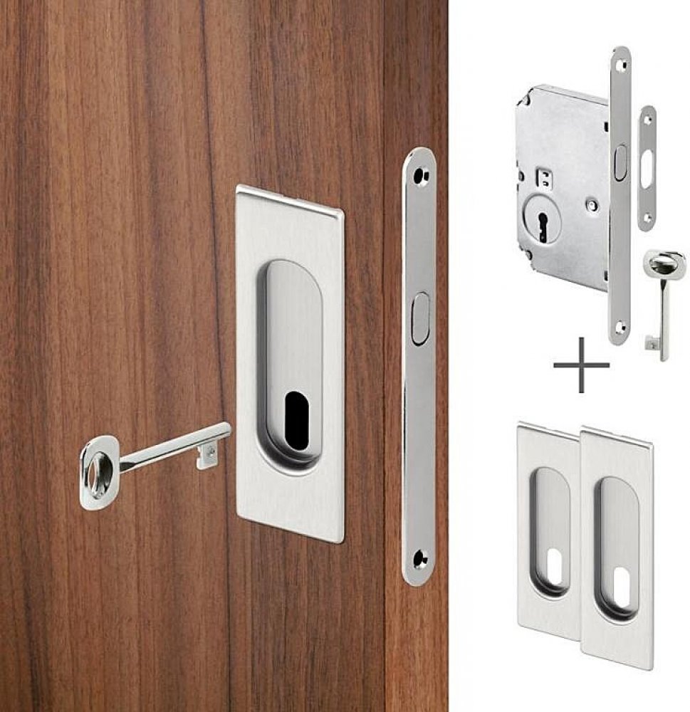 Výhodná sada dvou úchytů a zadlabacího zámku pro posuvné dveře. Dostupné v široké škále barevných provedení. Varianty s WC kličkou, obyčejným klíčem nebo stavební vložkou - fabkou.