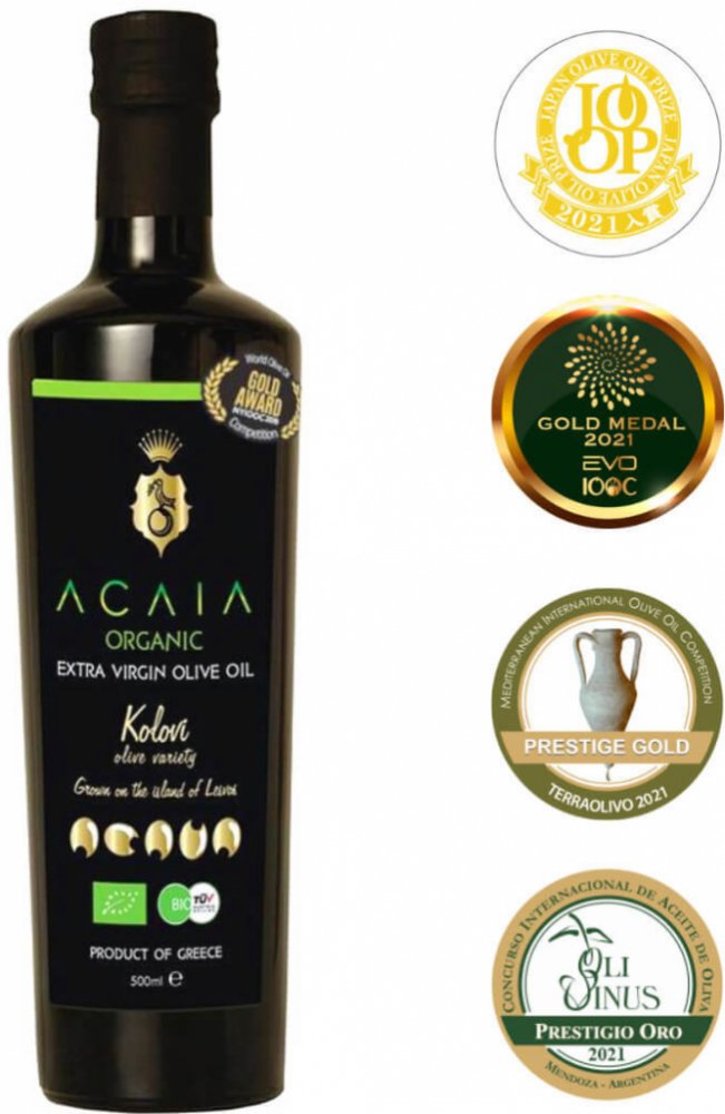 Olivový olej ACAIA je vyráběný z jedné z nejstarších olivových odrůd - odrůdy Kolovi, pěstované na nejkvalitnější půdě s vysokým obsahem břidlice v hornatých oblastech ostrova Lesbos. Olivy této odrůdy jsou sbírany především ručně za pomoci přenosných mechanických sběračů.
