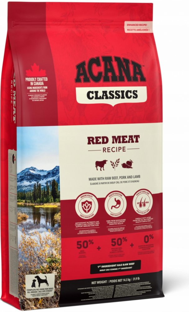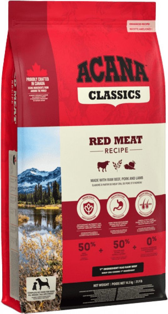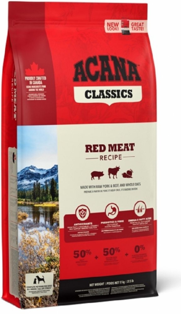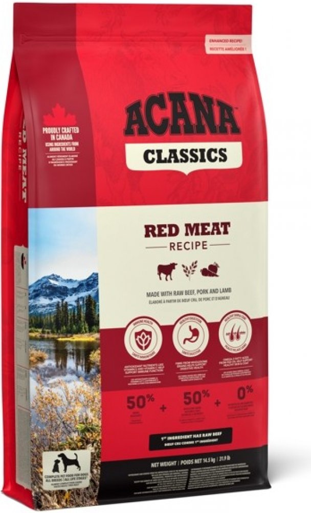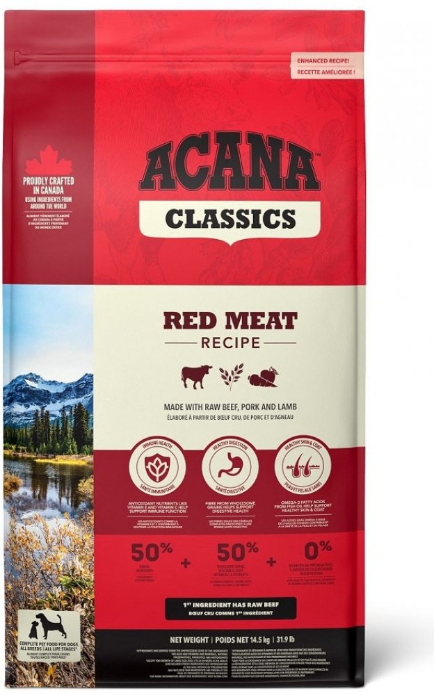Složení kvalitních granulí pro psy s hovězím a jehněčím masem ACANA Classic Red Meat: Syrové hovězí maso (16 %), dehydrované jehněčí maso (15 %), slzovka obecná, celý hrášek, ovesné kroupy, vepřový tuk (8 %), dehydrované vepřové maso (8 %), celý oves, cizrnová vláknina, syrové vepřové maso (2 %), rybí tuk (1%), chlorid draselný, sušená chaluha, sůl, sušený kořen čekanky, celá čerstvá dýně, čerstvá celá máslová dýně, čerstvá celá mrkev, celá čerstvá jablka, čerstvé celé hrušky, čerstvá celá cuketa, čerstvá kapusta, čerstvý špenát, čerstvé listy tuřínu, čerstvé listy červené řepy, celé brusinky, celé borůvky, celé plody muchovníku, kurkuma, ostropestřec, kořen lopuchu, levandule, kořen ibišku, šípky.