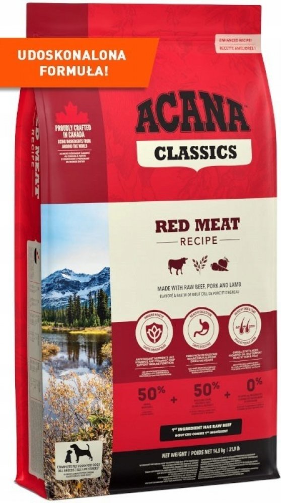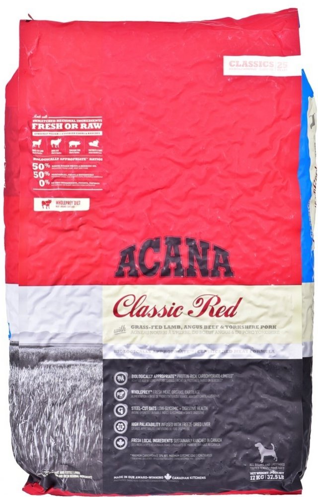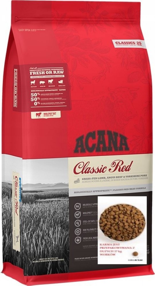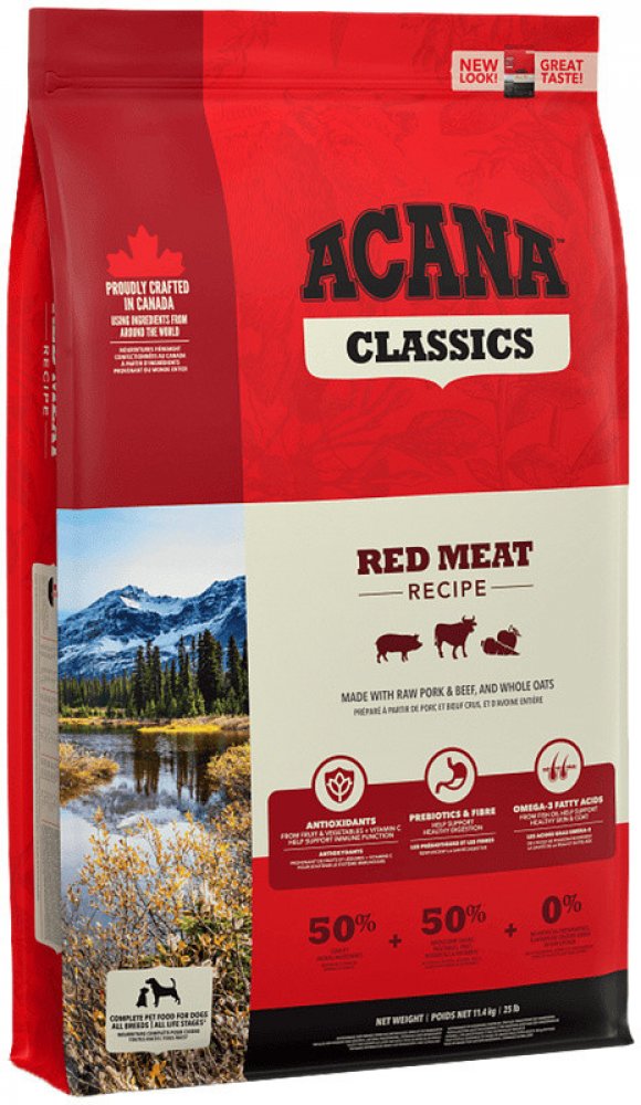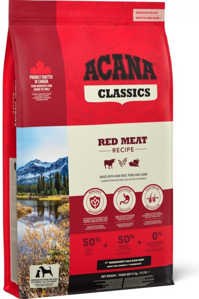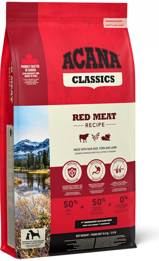 Složení kvalitních granulí pro psy s hovězím a jehněčím masem ACANA Classic Red Meat: Syrové hovězí maso (16 %), dehydrované jehněčí maso (15 %), slzovka obecná, celý hrášek, ovesné kroupy, vepřový tuk (8 %), dehydrované vepřové maso (8 %), celý oves, cizrnová vláknina, syrové vepřové maso (2 %), rybí tuk (1%), chlorid draselný, sušená chaluha, sůl, sušený kořen čekanky, celá čerstvá dýně, čerstvá celá máslová dýně, čerstvá celá mrkev, celá čerstvá jablka, čerstvé celé hrušky, čerstvá celá cuketa, čerstvá kapusta, čerstvý špenát, čerstvé listy tuřínu, čerstvé listy červené řepy, celé brusinky, celé borůvky, celé plody muchovníku, kurkuma, ostropestřec, kořen lopuchu, levandule, kořen ibišku, šípky.