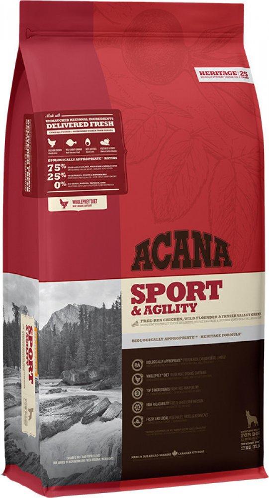 ACANA SPORT & AGILITY obsahuje výživné masové proteiny a základní tuky, jež příznivě působí na špičkovou kondici, a méně sacharidů. Lépe tak odpovídá přirozené psí stravě.