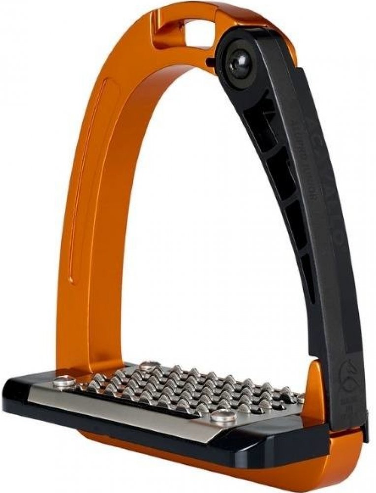 Bezpečnostní třmeny Acavallo Arena Alupro Safety JUNIOR s vyklápěcím ramenem vznikly po několikaletém výzkumu a vývoji. Patentovaný boční mechanismus umožňuje, aby se rameno při pádu otevřelo směrem ven a noha se uvolnila. Otevírací pojistka je umístěna o centimetr výše nad nášlapnou plochou; malý výstupek na jejím okraji brání sklouznutí chodidla a zabraňuje hromadění nečistot, aby uvolnění ramene nic nezdrželo.