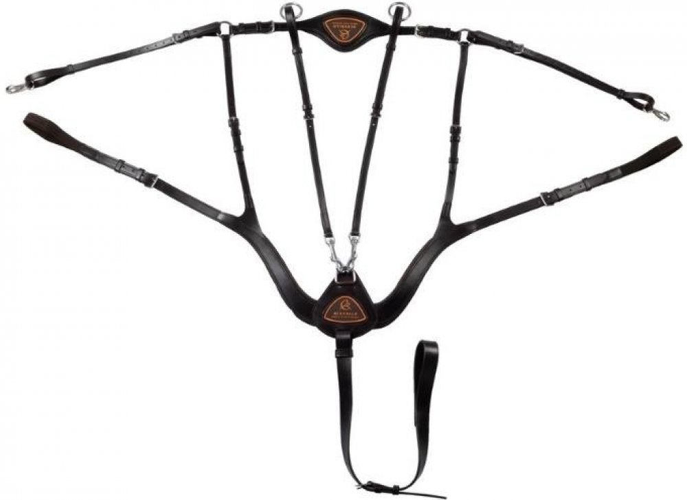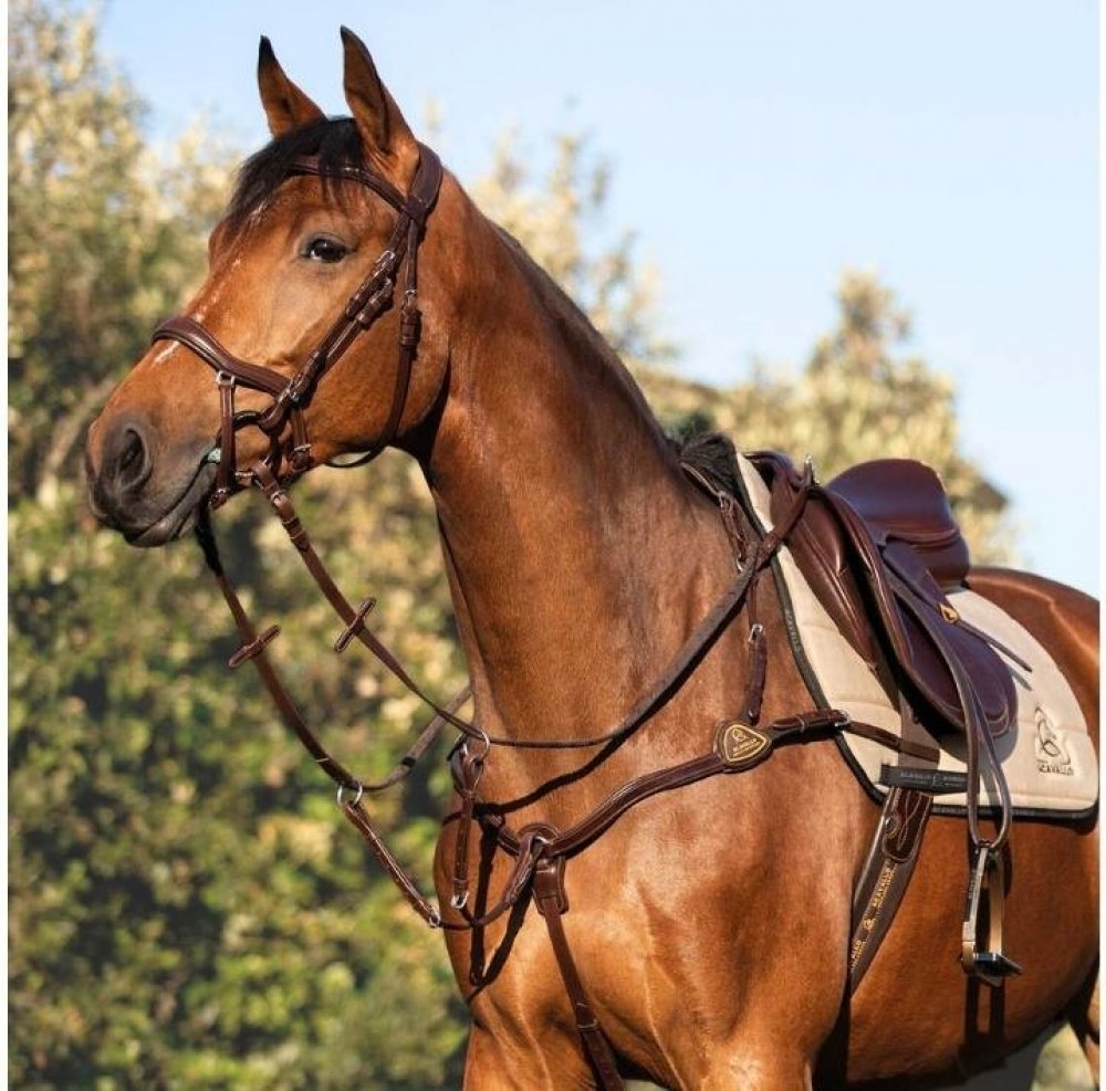 Luxusní anatomicky tvarovaný poprsník z italské telecí kůže fixuje sedlo na koni v pěti bodech.