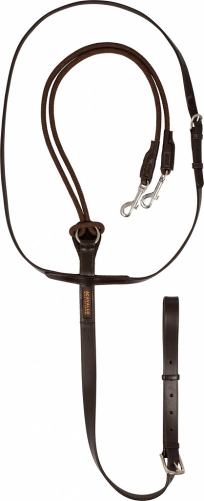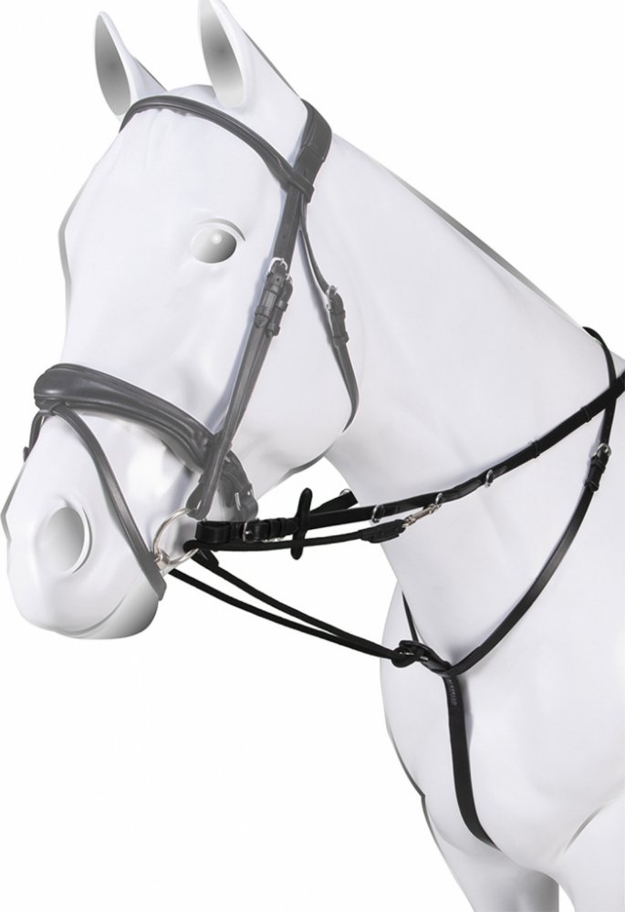 Komplet speciálního martingalu a otěží z pravé italské kůže a nylonu, nastavitelné otěže pomocí D-kroužků, větve martingalové vidlice se provlékají udidlovými kroužky a zapínají se do kovových kroužků na otěžích, spoje z nerezové oceli. Kolekce ACAVALLO Leather Passion. K dispozici také v cognac a tmavě hnědé barvě. Vyráběn ve velikostech COB a FULL.
