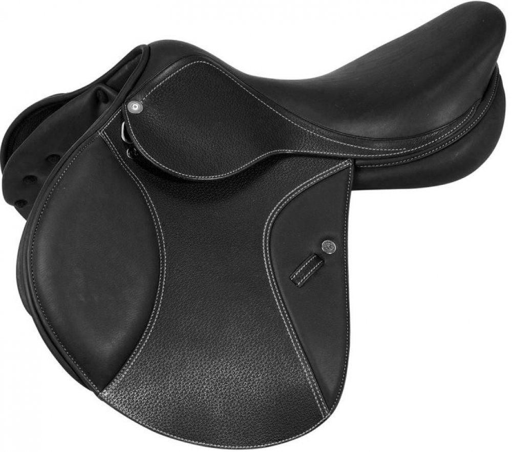 Profesionální skokové sedlo z vysoce kvalitní kůže s polohlubokým a širokým posedlím.