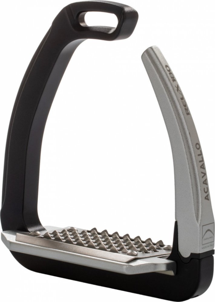 Bezpečnostní třmeny Acavallo Rel-X EASY 180° nabízí jezdci maximální komfort. Třmeny mají patentovaný boční uvolňovací mechanismus a pokročilé technické složení. Tento model Rel-X EASY 180° je navíc vybaven inovativním systémem. Otočné rameno se dokáže otevřít až o 180°, což umožňuje velmi snadné uvolnění nohy jezdce v případě pádu. Jsou vyrobeny z velmi kvalitního kovu a pružných polymerů - ve srovnání s tradičními třmeny nabízí řada Rel-X-EASY větší pohodlí a odpružení při jízdě. Extra široká nášlapná plocha, která je skloněná pod úhlem 5° tlumí nárazy jezdcovy váhy - např. v lehkém sedu/ během skákání, a zajistí maximální jezdecký komfort. Výhody pro jezdce spočívají v silné úlevě nohou, kotníků, kolen a boků. Nerezová ocel chrání nášlapnou plochu proti korozi a zaručuje tak dlouhou životnost produktu. Třmen je vybaven patkou se systémem Grip a je pokryt hliníkem s povrchovou úpravou „shot peening. Třmeny jsou navíc velmi lehké, přesto extrémně odolné. Hmotnost jednoho třmenu 519 g. Dodávané v páru a v jedné univerzální velikosti s šířkou nášlapné plochy 12,5 cm.