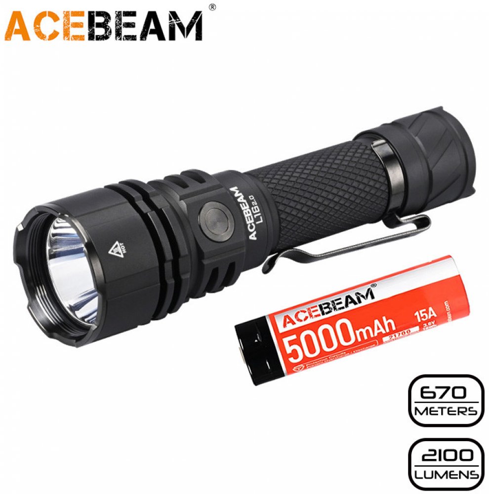 Acebeam L16 2.0 je aktualizovaná verze oblíbené taktické svítilny - vylepšení jsou v tomto případě extrémní. Disponuje světelným tokem až 2100 lumenů (ANSI) a mimořádným dosvitem 670 metrů. Světelného výkonu bylo dosaženo kombinací LED Luminus SFT40 a hladkého hlubokého reflektoru. K napájení slouží vysokoproudový Li-ion akumulátor 21700 5000 mAh (součást balení), který se nabíjí přímo ve svítilně...