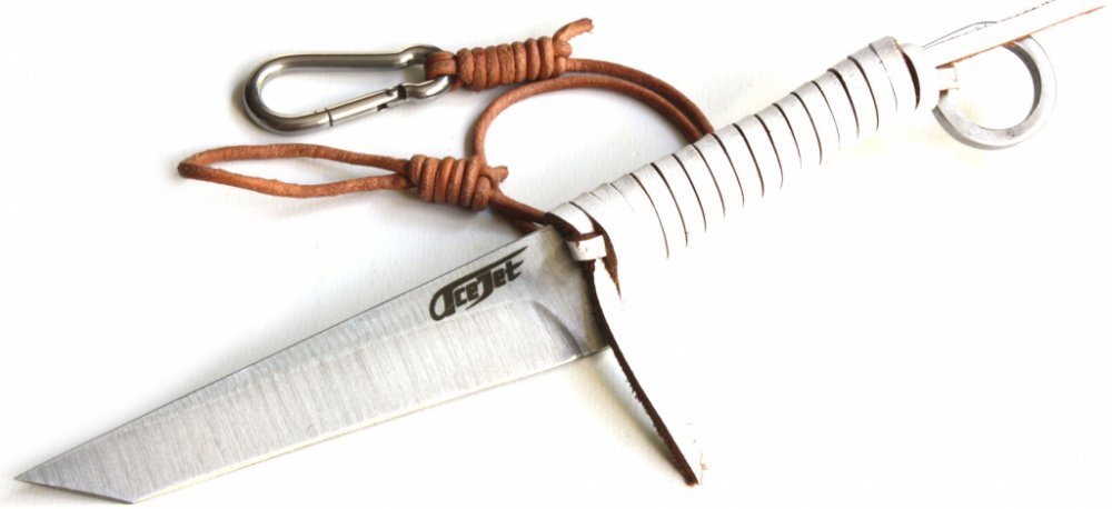 K noži je zdarma mosazná karabina a pevná kožená šnůrka pro zajištění nože a zamezení jeho ztráty ihned po použití.