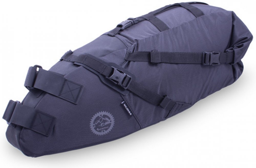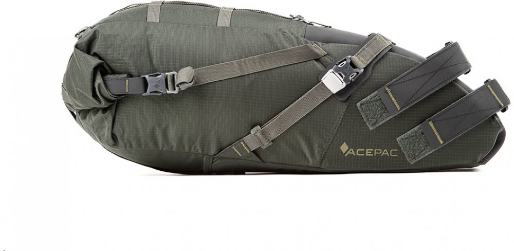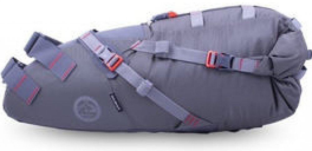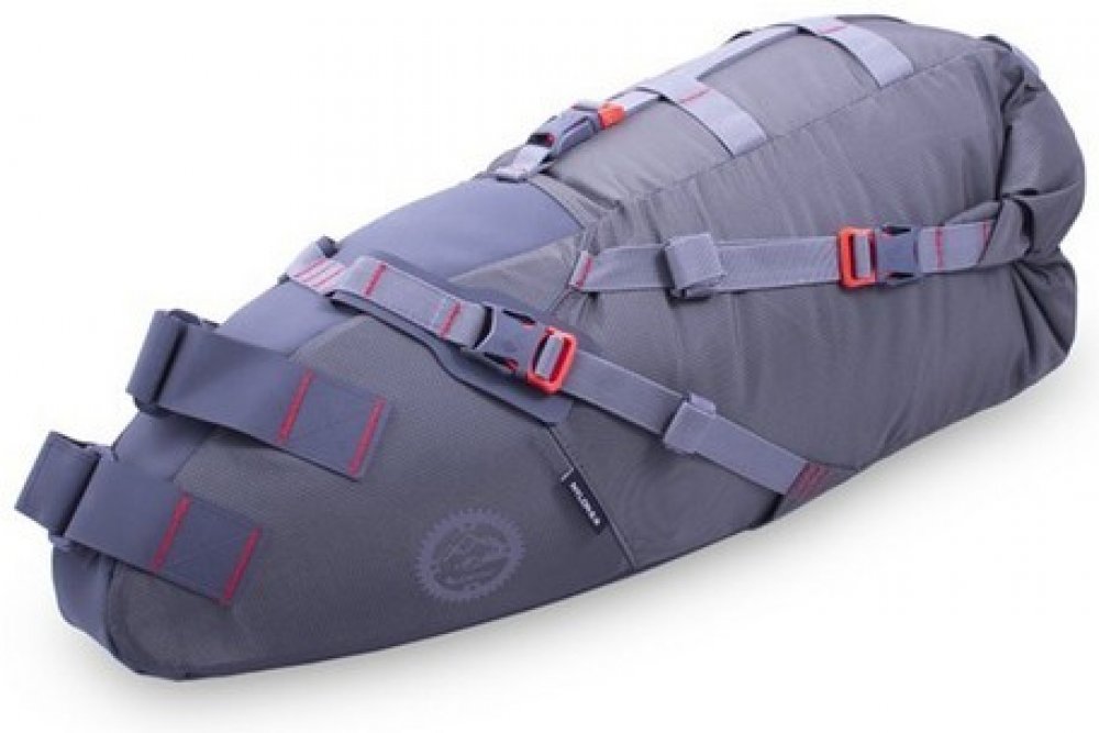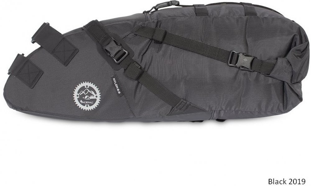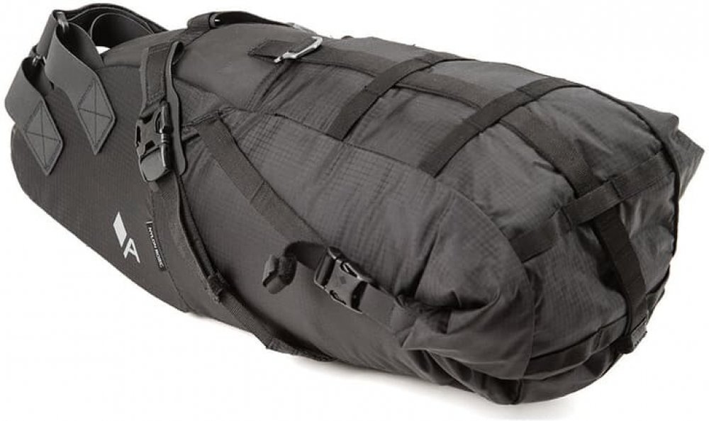 Popruhy pro připevnění na sedlovku z materiálu Hypalon s podkládací hypalonovou chlopní. Popruh kolem sedlových vzpěr je polypropylenový, pošitý Hypalonem pro zaručení maximální možné fixace a eliminaci pohybu brašny na vzpěrách. To v kombinaci se třemi kompresními polypropylenovými popruhy (100% recyklovatelné) se značkovými sponami Duraflex a Nifco pro snadné ovládání v rukavicích. Možností jak brašnu velikostně přizpůsobit náplni je tedy dostatek.