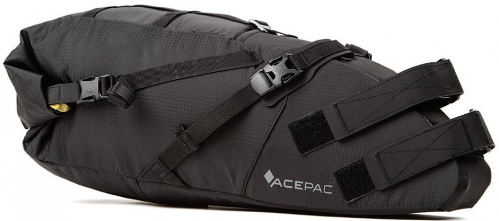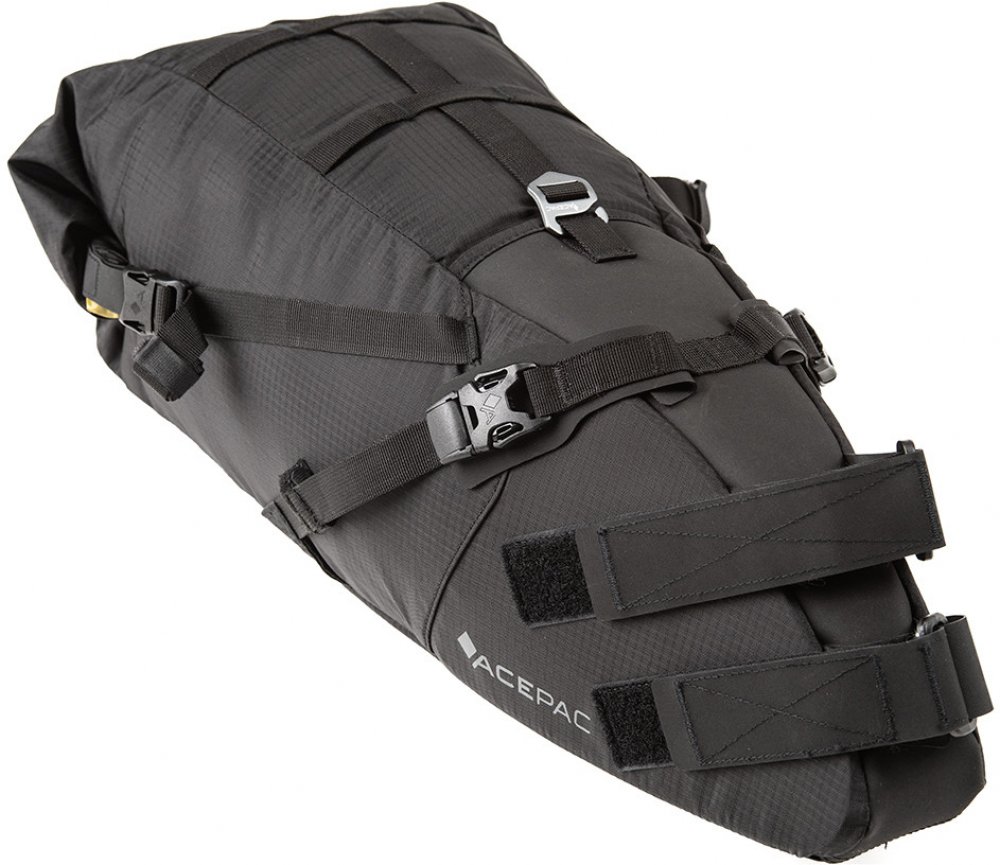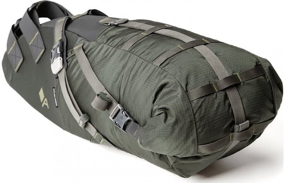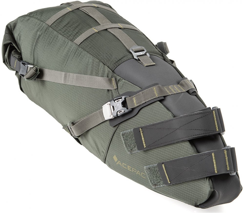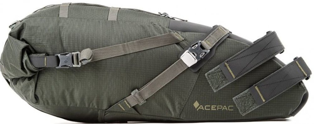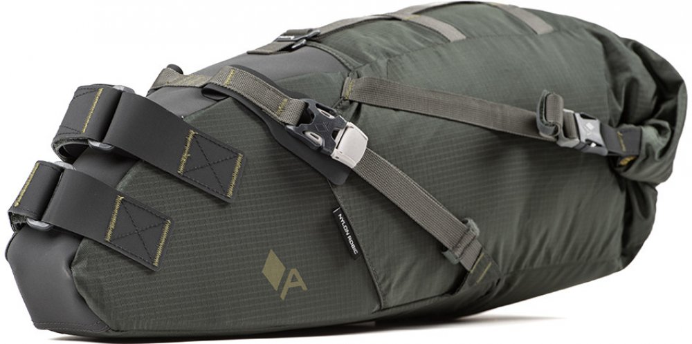 Popruhy pro připevnění na sedlovku z materiálu Hypalon s podkládací hypalonovou chlopní. Popruh kolem sedlových vzpěr je polypropylenový, pošitý Hypalonem pro zaručení maximální možné fixace a eliminaci pohybu brašny na vzpěrách. To v kombinaci se třemi kompresními polypropylenovými popruhy (100% recyklovatelné) se značkovými sponami Duraflex a Nifco pro snadné ovládání v rukavicích. Možností jak brašnu velikostně přizpůsobit náplni je tedy dostatek.