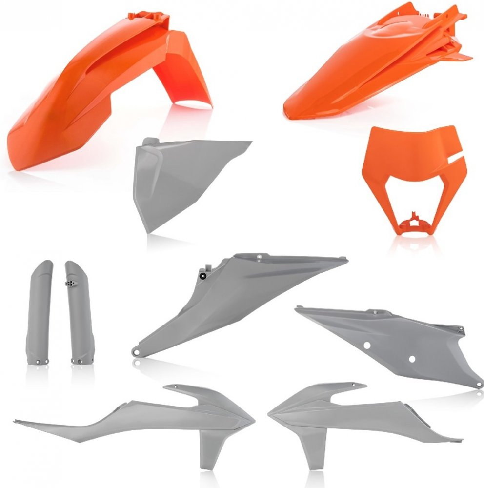 Sada plastového kitu se skládá ze zadního blatníku,předního blatníku,spoilerů,bočnic,masky na světlo,chrániče vidlic a krytu airboxu.V oranžovém kitu jsou všechny plasty oranžové,barva 016,v bílém bílé,v černém černé,v replice jsou chrániče vidlic a zadní blatník černý,přední blatník,podsedlovky,air box,maska světla oranžové,spoilery oranžovočerné.V oranžovo černém je přední blatník a maska světla oranžová,zadní blatník,chrániče vidlic,airbox,spoilery a bočnice černé.V replice 21 je přední blatník,zadní blatník a maska oranžové,chrániče vidlic černé,bočnice a air box šedé.V černošedém jsou chrániče vidlic,přední blatník,zadní blatník a maska světla černá,podsedlovky,airbox a spoilery šedivé.V oranžovošedém jsou chrániče vidlic,podsedlovky,air box a spoilery šedé,přední blatník,zadní blatník a maska světla oranžové.V šedooranžovém chrániče vidlic,podsedlovky,air box a zadní blatník šedý,spoilery oranžovošedé,přední blatník a maska světla oranžové.V modrooranžovém je přední blatník,chrániče vidlic a maska světla oranžové,podsedlovky (bočnice) , air box a zadní blatník modré, spoilery modrooranžové.Plasty světoznámé italské značky ACERBIS,která vyrábí náhradní plastové díly pro motocykly již od roku 1973. Díky použití speciálního materiálu mají vynikající pružnost a pevnost,s dlouhou životností a vysokou odolností proti poškození.Plasty Acerbis vyráběné v Itálii se vyznačují stálostí barev a všechny mají originální tovární tvar podle modelu.Jsou tak zárukou vysoké kvality a propracovanosti výrobku. Za kvalitu svého zboží ručí a nedopustí, aby nesplňovalo podmínky, které jsou od něj požadovány (homologace,voděodolnost,savost,pevnost,barevnost,pružnost,vzdušnost....)
