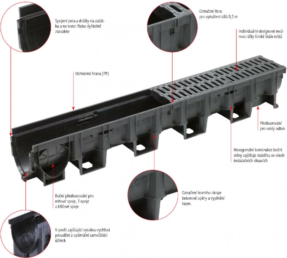 U běžných systémů odvodňovacích systémů pr opustné spoje znamenají, že část vody na cestě do separačních systémů unikne a těmto únikům nelz e zabránit. Nový odvodňovací žlab ACO však pomáhá odvádět a čistit povr chovou vodu cíleným způsobem. To bylo potvrzeno zejména dlouhodobým testováním, které provedl institut pro podzemní infrastrukturu IKT, a na jehož základě jsou žlaby ACO označeny jeho certifikátem „Schváleno institutem IKT”.