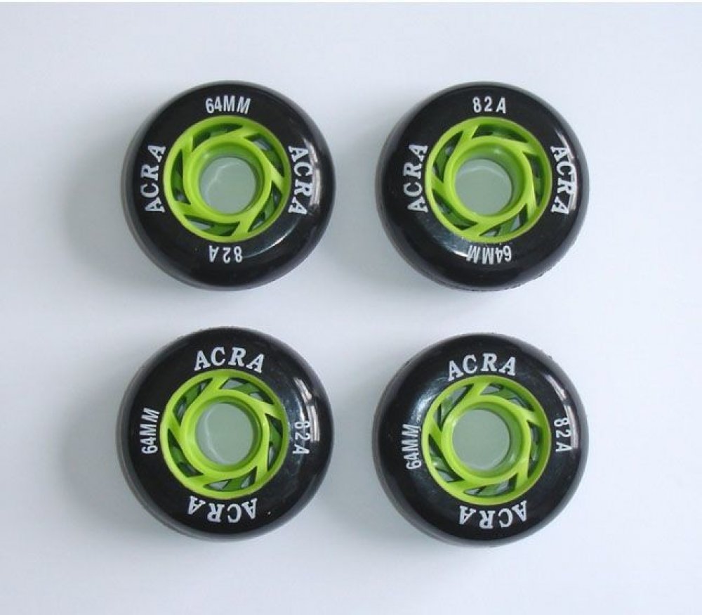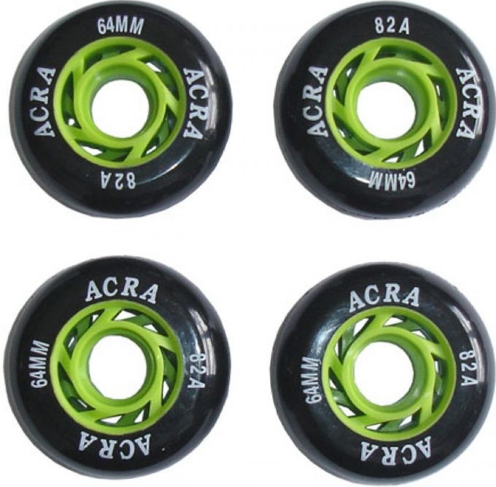 ACRA SKATE Náhradní kolečka do kolečkových bruslí 64 x 24 mm - CS05 Náhradní kolečka do kolečkových bruslí průměr 64 x 24 mm, kolečka jsou vyrobena z měkkého vrstveného PU, 4 ks v blistru. Cena je za 4 kusy. K dispozici provedení viz foto - černo-zelené.