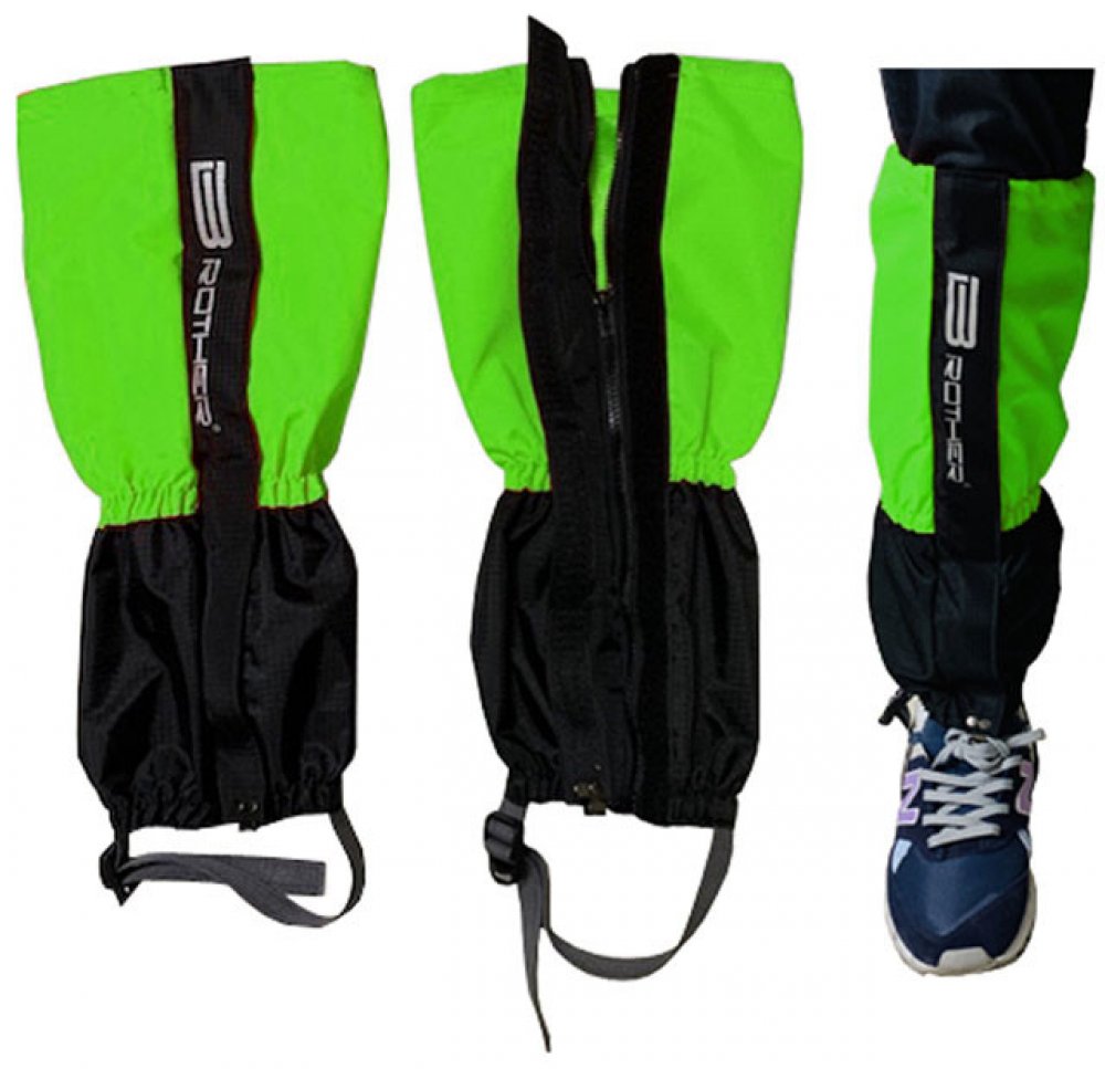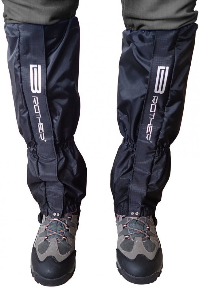 Textilní turistické návleky na boty. Použitý materiál je nylon 420D Oxford s voděodolným PU potahem uvnitř návleku. Dodáný je v černé barvě s potiskem BROTHER. Návlek má na výšku 47 cm, průměr návleku je 16 cm. Návlek má dvě našité stahovací gumy na spodní straně na botách a nad kotníkem a jednu stahovací šňůru, kterou se návlek upevní na lýtko nohou podle potřeby. Navíc má návlek z boku silný zip pro možnost nasazení na obuté boty. Zip je po celé délce krytý vrchním lemem. Lem je po celé délce opatřený suchým zipem pro ochranu před proniknutím vnější vlhosti nebo sněhu dovnitř návleku. Návlek je na spodní straně vybavený stahovacím polyamidovým páskem s plastovou přezkou na upevnění návleku pod botami proti vyhrnování při chůzi těžkým terénem. Pro chůzi v lehčím terénu je návlek vybavený pro rychlé a jednoduché upevnění na šněrovadlo bot mosazným háčkem. Díky pružným gumám a stahovací šňůře na lýtku je návlek dodávaný v jedné universální velikosti. Balení v sáčku s visačkou obsahuje 1 pár návleků.