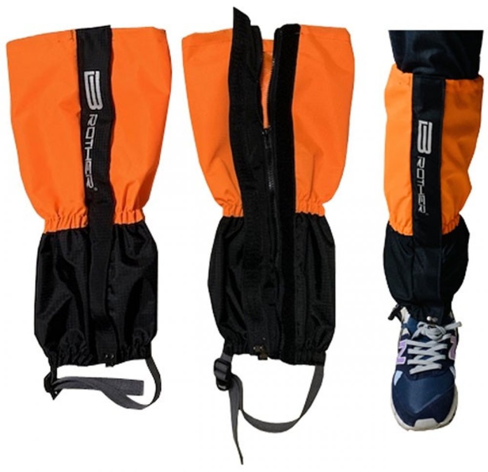 Textilní turistické návleky na boty. Použitý materiál je nylon 320D Oxford s voděodolným PU potahem uvnitř návleku. Dodaný je v černo oranžové barvě s potiskem BROTHER. Návlek má na výšku 47 cm, průměr návleku je 16 cm. Návlek má dvě našité stahovací gumy na spodní straně na botách a nad kotníkem a jednu stahovací šňůru, kterou se návlek upevní na lýtko nohou podle potřeby. Navíc má návlek z boku silný zip pro možnost nasazení na obuté boty. Zip je po celé délce krytý vrchním lemem. Lem je po celé délce opatřený suchým zipem pro ochranu před proniknutím vnější vlhosti nebo sněhu dovnitř návleku. Návlek je na spodní straně vybavený stahovacím polyamidovým páskem s plastovou přezkou na upevnění návleku pod botami proti vyhrnování při chůzi těžkým terénem. Pro chůzi v lehčím terénu je návlek vybavený pro rychlé a jednoduché upevnění na šněrovadlo bot mosazným háčkem. Díky pružným gumám a stahovací šňůře na lýtku je návlek dodávaný v jedné universální velikosti. Balení v sáčku s visačkou obsahuje 1 pár návleků.