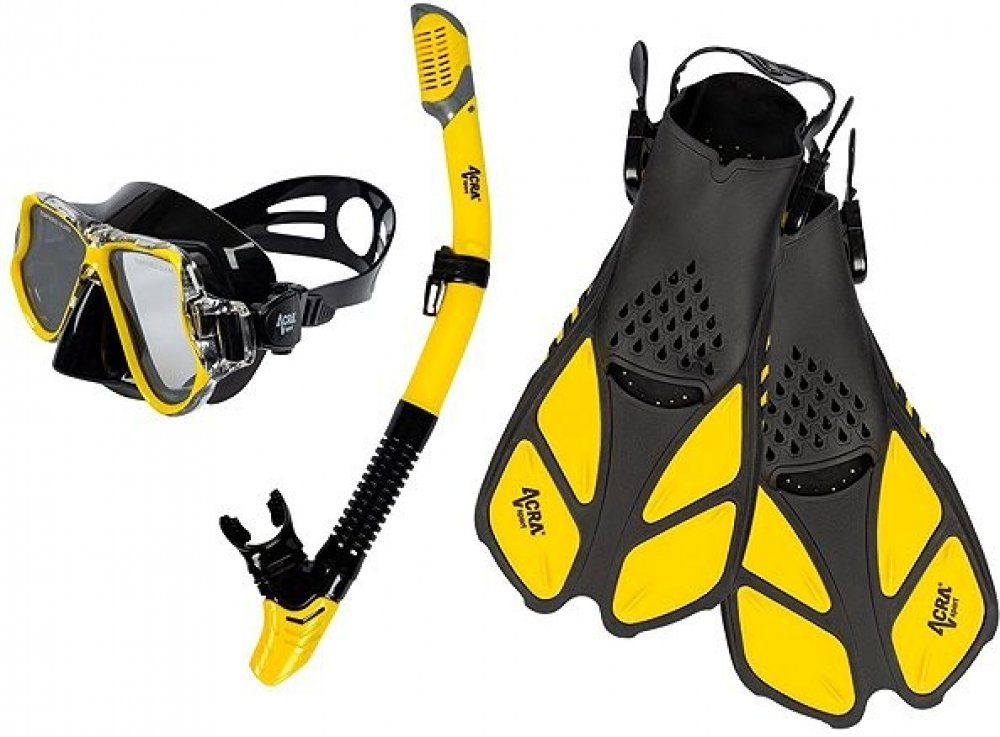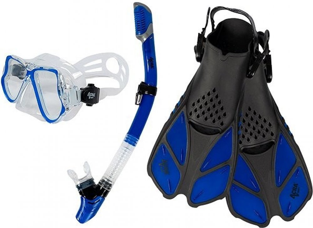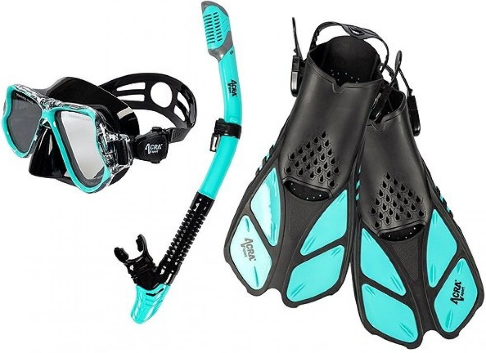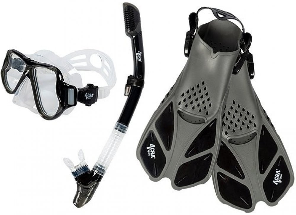 Sada šnorchlu Acra Sport s nastavitelnými ploutvemi, maska z tvrzeného skla se dvěma průhledy, silikonový šnorchl Dry Top a cestovní taška na vybavení. Šnorchlovací set Acra je dokonalý společník na cesty a je vhodný pro šnorchlování, plavání, potápění a mnoho dalšího.
