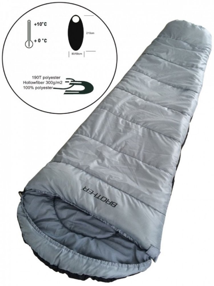 Kvalitní mumiový spacák o rozměrech 210 x 80/55 cm, vhodné pro každého dospělého, vnitřní složka z bavlny, duté vlákno s výbornými tepelně izolačními vlastnostmi, minimální venkovní teplota -6 °C, šedá barva