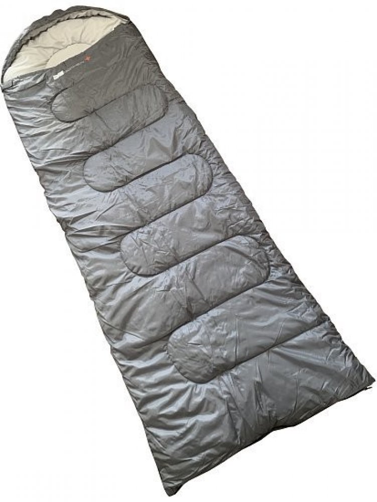 Spacák PILOT o rozměrech 220 x 75 cm, vhodné pro každého dospělého, duté vlákno s výbornými tepelně izolačními vlastnostmi, minimální venkovní teplota -7 °C, šedá barva.