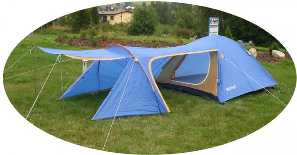 - Typ: Jednoplášťový tunelový stan s předním vchodem.