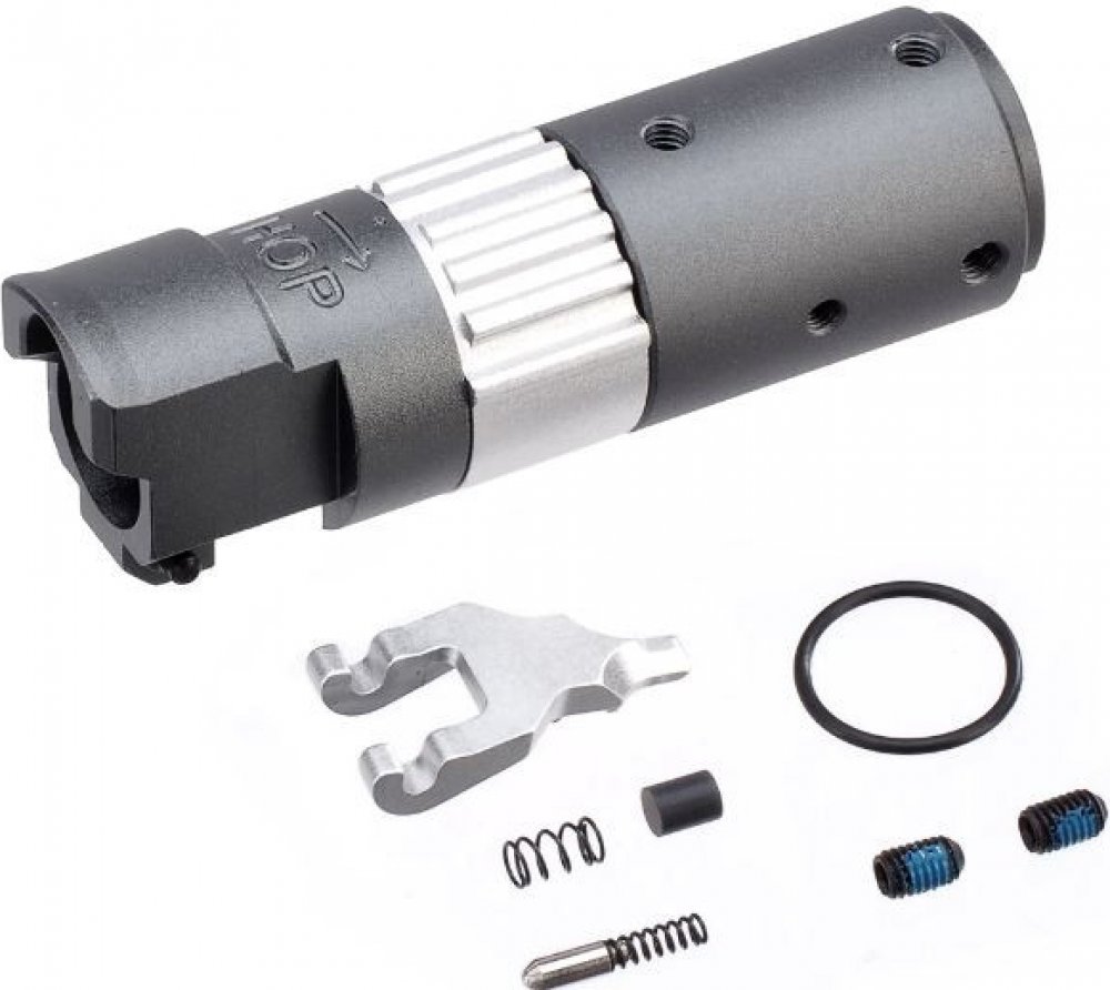 Tato precizní hliníková hop-up komora je navržena pro populární plynové full-auto pistole Action Army AAP-01 a AAP-01C. CNC obrábění z kvalitního hliníku zajišťuje vysokou pevnost a výborné těsnění. Komora výrazně zlepšuje konzistenci výkonu a umožňuje přesnější a jemnější nastavení přítlaku hop-up gumičky. Díky přepracovanému systému přítlaku je určena pro používání těžkého střeliva 0,28-0,40 gramů. Kotvící zámky komory jsou dimenzovány pro použití s vnitřními hlavněmi typu GBB / VSR. Vnitřní uspořádání komory zajišťuje optimální tlak okolo hop-up gumičky, a tím dosáhne perfektního utěsnění celé sestavy pro dosažení maximální úsťové rychlosti a spolehlivého podávání. Spolu s kvalitní hop-up gumičkou a vnitřní hlavní je komora základní upgrade díl pro zvýšení přesnosti a dosažení delší dráhy letu kuličky. Jedná se o upgrade díl přímo od výrobce, takže dokonalá kompatibilita kus za kus je zaručena.