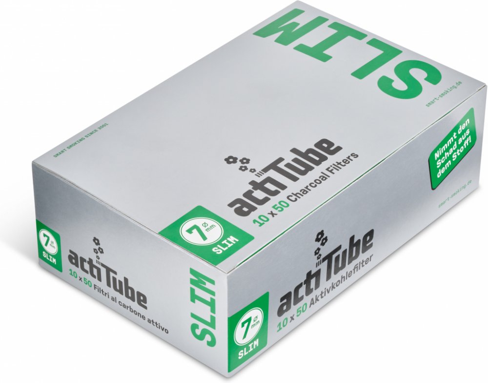 Actitube Slim filtry uhlíkové jsou novinkou z řady Actitube filtrů. Actitube je nová značka dřívějších Tune filtrů.Oproti normálním actitube jsou užší (7mm) a kratší (26mm). Ostatní vlastnosti zůstávají stejné - díky aktivnímu uhlí umožňují skvělý kuřácký prožitek.Actitube filtry jsou vhodné především na balení cigaret. Aktivní uhlí filtruje většinu škodlivin z vdechovaného kouře, nechávaje je usazené ve filtru, který se pak může snadno odstranit.Umožňuje tak velmi jemné pokouření bez škodlivého nežádoucího účinku.Speciální uzávěr filtru je upraven tak, aby se nezanášel a tím se neucpával, což by kouření znepříjemňovalo.Na rozdíl od běžných uhlíkových filtrů a zabraňuje vnikání zkondenzovaného kouře do úst!Další výhody actiTube filtrů: vylepšená chuť, méně napadené plíce,směs kouře je jemnější, snadnější kouření..Průměr filtru: 7mmDélka filtru: 26mmBalení: 10x50ks