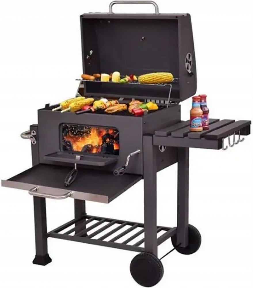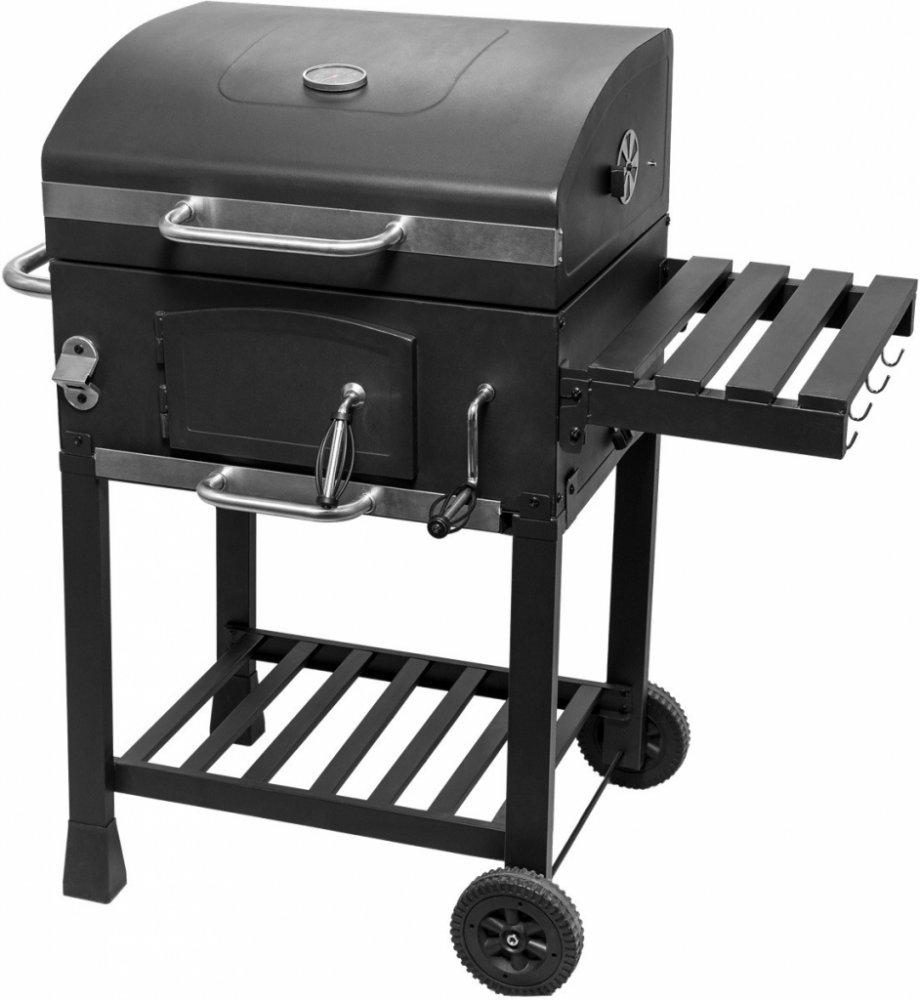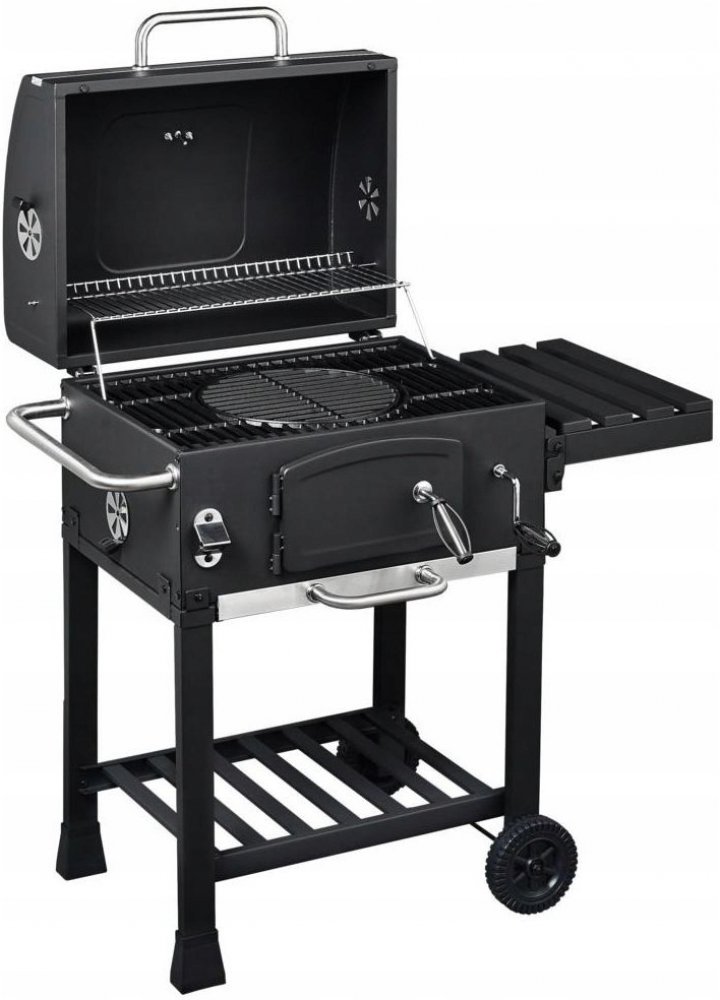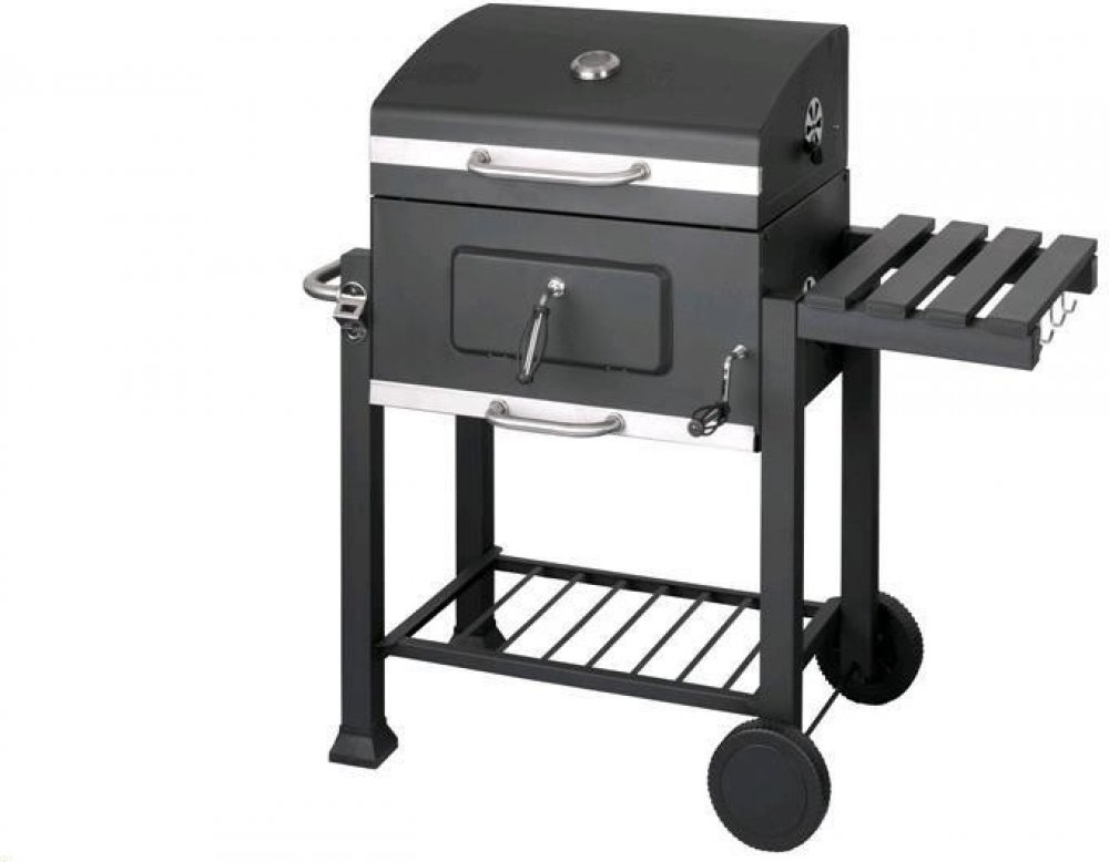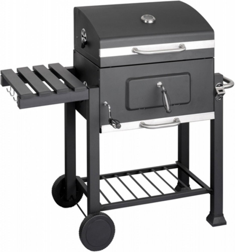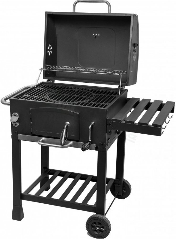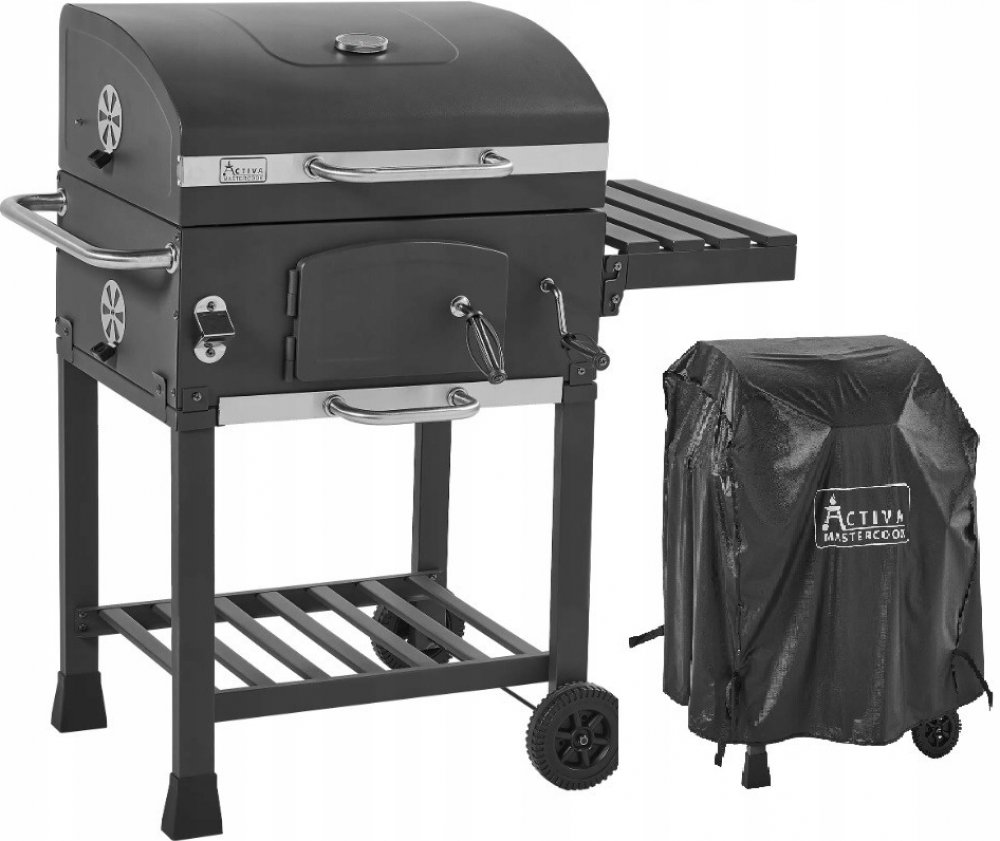 Pokud jste příznivci grilování nad žhavými uhlíky, německá společnost Activa pro Vás přichystala skutečný XXL gril Angular, vhodný pro pohoštění až dvanácti osob. Tento gril s nádherným klasickým designem se nejenom velmi jednoduše obsluhuje, ale je i skvěle vybavený a má řadu praktických doplňků. Kovové plochy grilu jsou opatřeny kvalitní vrstvou práškové barvy, velký dělený grilovací rošt je opatřen odolným smaltem a přídavný výklopný rošt je pochromovaný. Na přídavném roštu můžete pokrmy udržovat ve správné teplotě anebo v kombinaci s víkem využít možnosti nepřímého grilování. Regulace teploty je možná několika způsoby. Buď pomocí 2 ventilačních otvorů ve víku a 2 v těle grilu anebo pomocí výškově regulovatelné vany na uhlí. Rozžhavené uhlí tak pomocí otočné rukojeti podle potřeby lehce přibližujete nebo oddalujete od grilovaného pokrmu. Pro snadné přikládání i během grilování je tělo grilu opatřeno v čele velkými dvířky. Ve spodní části grilu je potom odnímatelný popelník. Pro sledování teploty je ve víku grilu umístěn teploměr. Z dalších praktických doplňků potom můžeme jmenovat velkou odkládací plochu se čtyřmi háčky na grilovací náčiní, integrovaný otvírač na láhve, další boční madlo vhodné třeba pro zavěšení grilovacích kleští a ještě jednu odkládací plochu ve spodní části grilu. Gril je díky čtyřem pevným nohám velmi stabilní a díky dvěma kolečkům se s ním i snadno manipuluje.