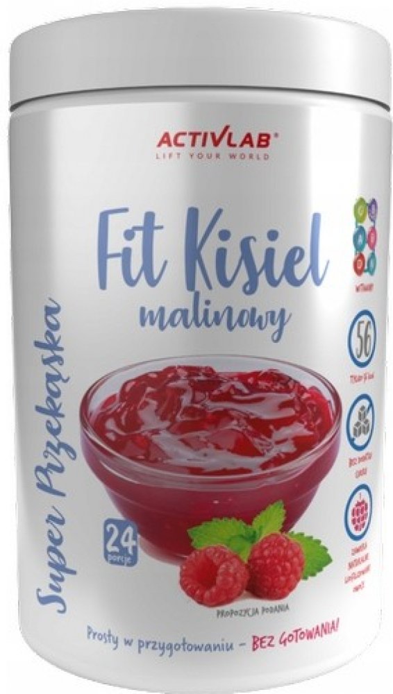FIT KYSEL MALINOVÝ je nízkokalorická svačinka bez přidaného cukru, obohacená o vitamíny: A, D, E, K, C, B-komplex. Obsahuje sladidlo a přirozeně se vyskytující cukry. Vitamíny obsažené v produktu: podporují imunitu (vit. C, D), likvidují volné radikály (vit. C, E), podporují správnou tvorbu kolagenu (vitamínů C). Kysel má malinovou příchuť a obsahuje přídavek přírodního, lyofilizovaného ovoce. Příprava kisielu je velmi jednoduchá a nevyžaduje vaření. Každá porce produktu poskytuje pouze 56 kcal.