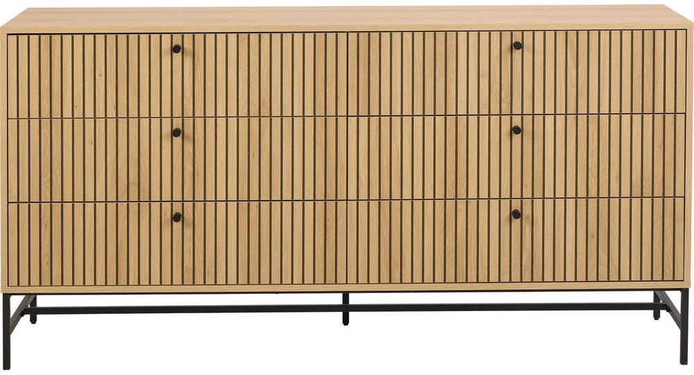 Komoda Albany v dekoru dubu má moderní lamelové čelo a šest zásuvek, které poskytují velkorysý úložný prostor. Černá práškově lakovaná základna je vyrobena z oceli a perfektně ladí s minimalistickými černými úchytkami. Certifikát FSC™ dokládá, že komoda vznikla v souladu se zásadami udržitelného lesního hospodářství.