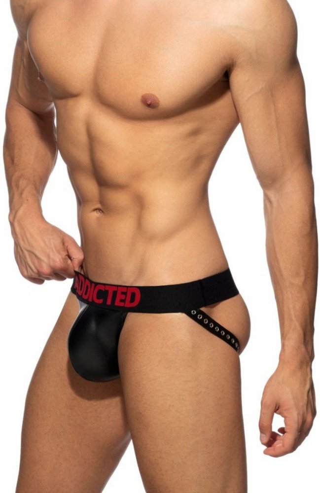 Fetiš push-up jocksy z černé pogumované látky s technologií ring-up (erekční kroužek pro větší objem). Velmi pohodlné a jemné na dotek, s ADDICTED logem na gumě. 95 % polyester, 5 % elastan.