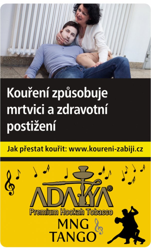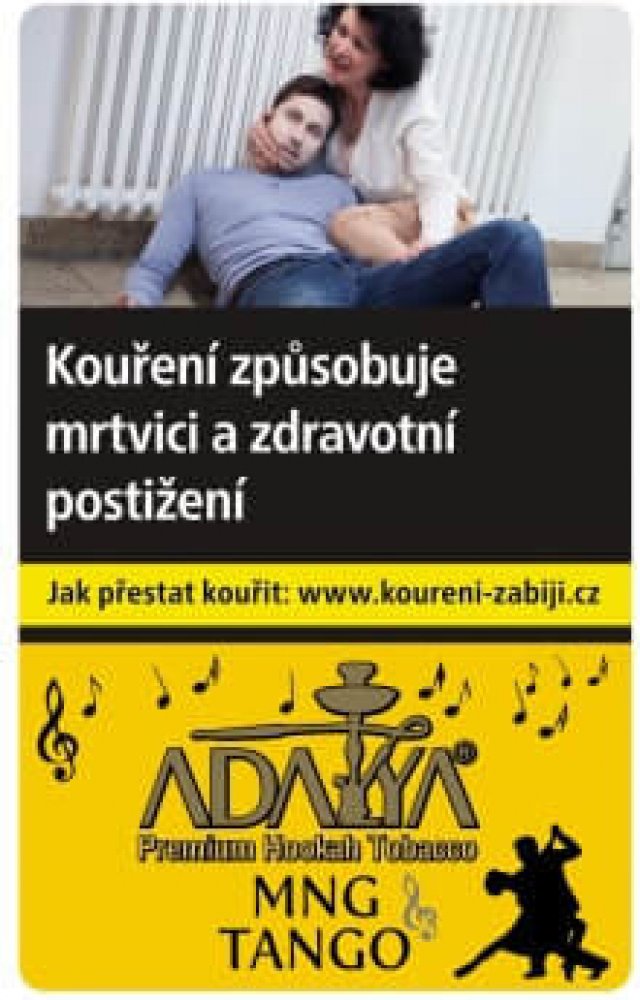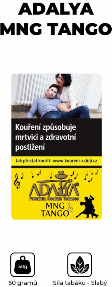 Tento produkt smí koupit pouze osoby starší 18 let.Pouze pro objednávky z České republiky.Temperamentní a nabité energii jako tango a zároveň sladké a šťavnaté jako mango. K tomu přidejte trochu maracuji a výsledkem se nechte překvapit v roztančeném dýmu tabáku Adalya Mng Tango.Tabáky Adalya do vodní dýmky jsou prémiové turecké tabáky do vodních dýmek vyrobené výhradně z kvalitních odrůd tabáku, zpracované do prvotřídní kvality pro použití do vodní dýmky. Dokonalá absorbční schopnost tabáků Adalya do vodní dýmky je nepostradatelná, zejména při jejich následném míchání a naložení v melasách, které jsou připraveny podle nejpoptávanějších příchutí. Na světovém trhu patří tabáky Adalya do vodní dýmky mezi nejprodávanějšími tabáky do vodních dýmek. Díky mnohaleté tradici se kuřáci tabáků Adalya pro vodní dámky mohou těšit na bezkonkurenční a originální příchutě nakombinované v tom nejlepším poměru.