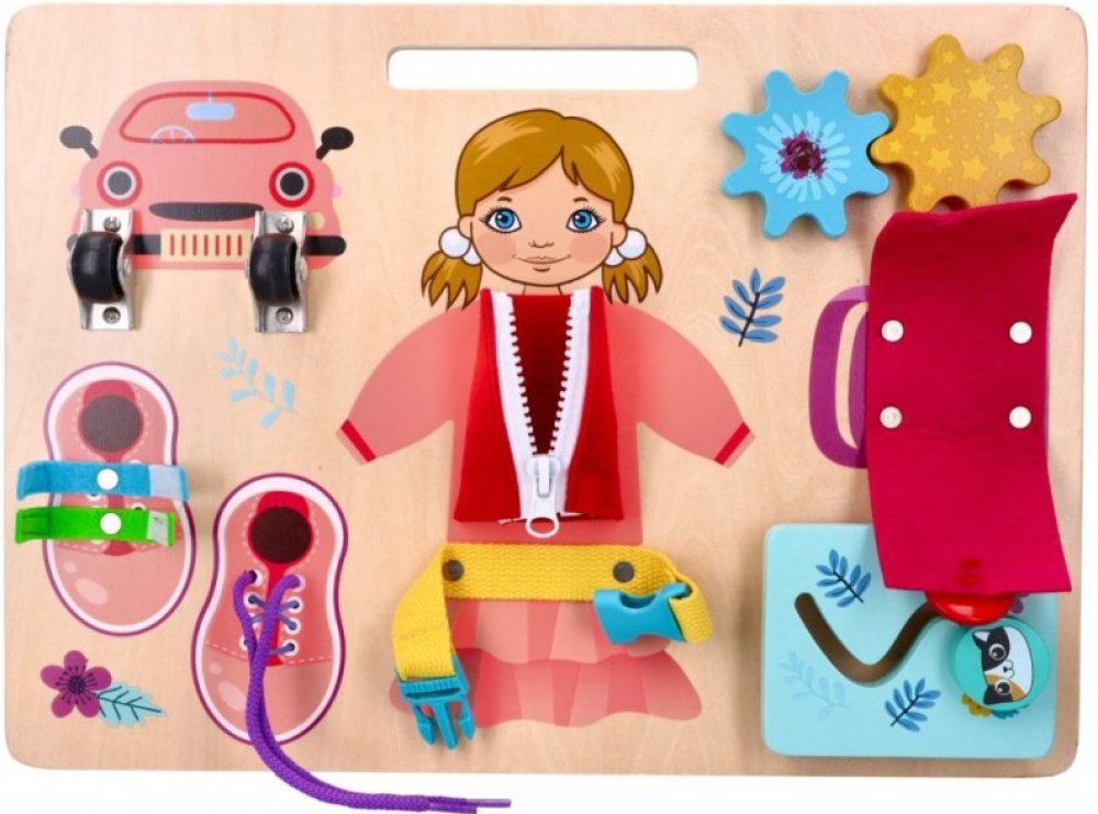 Tato tabule umožní trénink motoriky ruky díky různým zámkům a uzávěrům, které lze otevřít. Najdete zde pohyblivá kola auta, suchý zip a tkaničku, ozubené kolečka, zip, přezku a knoflík a posuvnou kočičku.
