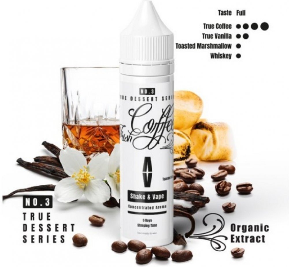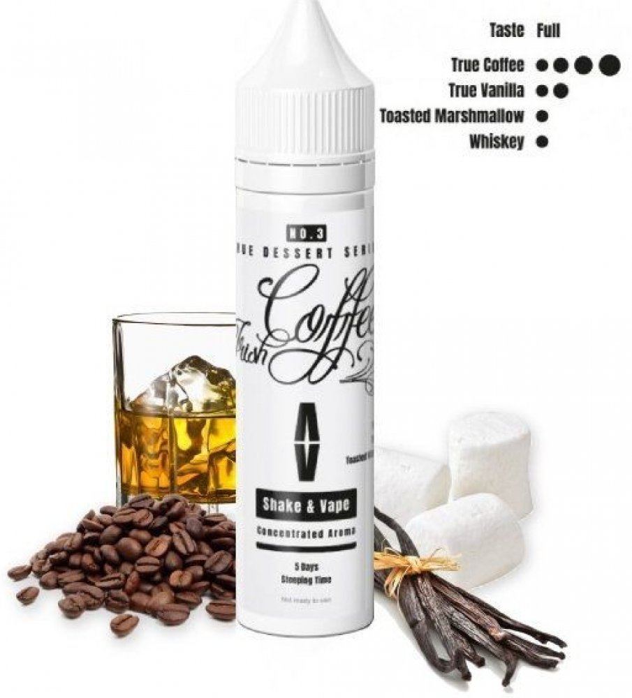 Na první potah krásně mléčná a velmi reálná káva, při delším vapování nastoupí vanilka, whiskey a celý chuťový profil dokončují opečené marshmallows. Při výrobě tohoto Shake & Vape jsou použity atestované výtažky kávy a vanilky.