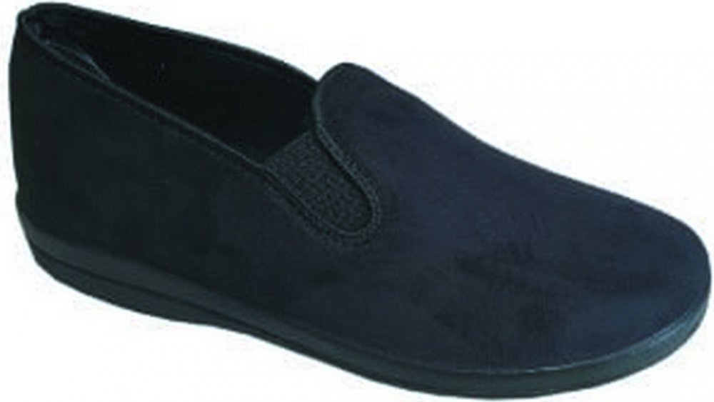 Pánské pantofle značky Adanex se vyznačují svým "festovním" střihem a vysoce kvalitními materiály. Svršek je vyroben z pevného, krátko střiženého stálotvarého semiše v temně modré barvě. Lehká podešev s anatomickou výškou klínku je neznačkující (nedělá šmouhy).